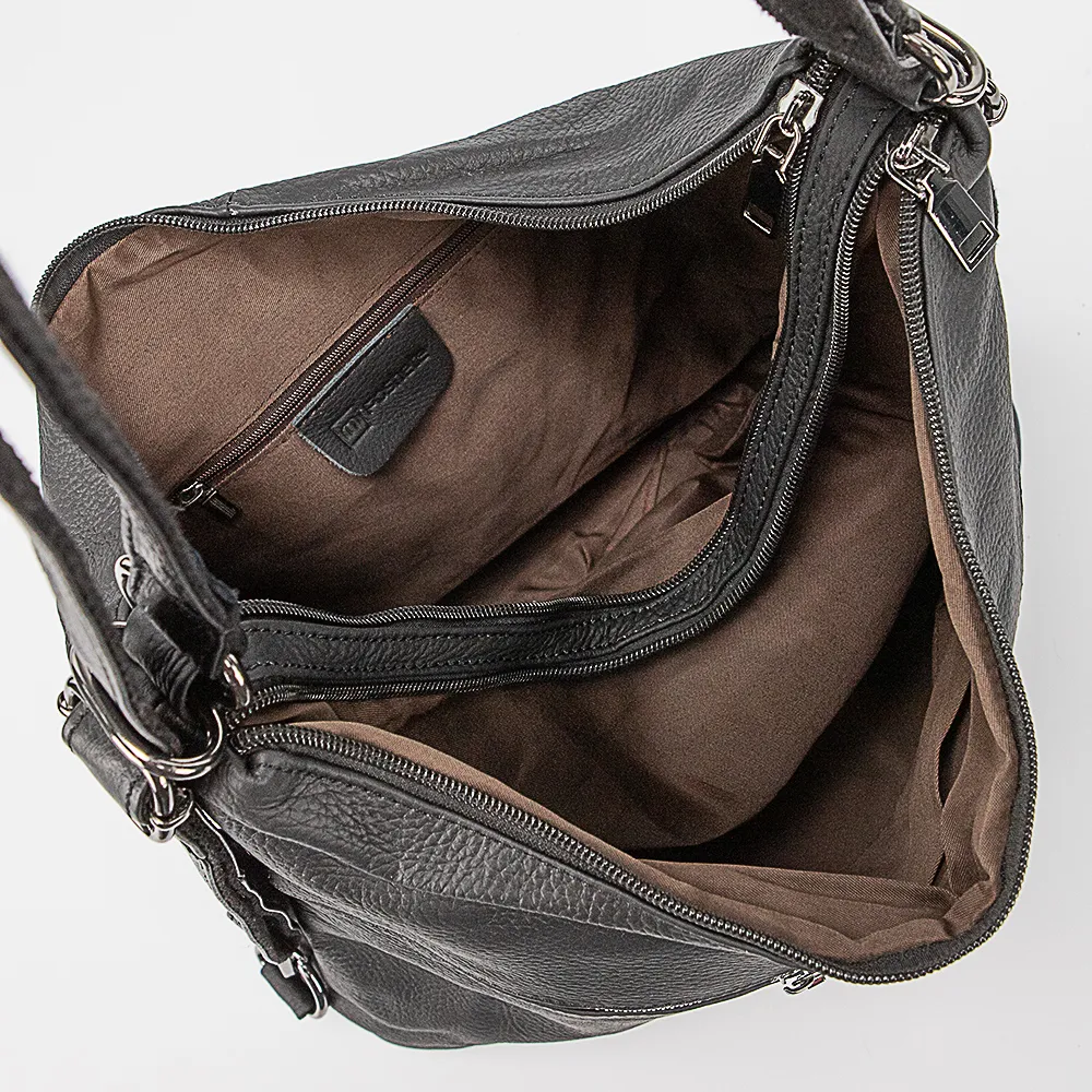 Сумка-рюкзак от торговой марки Poshete из натуральной кожи черного цвета. Модель с двумя ручками, стягиваемыми в плечевые лямки. Два отделения на молнии, с текстильной подкладкой. В одном из отделений – карман на молнии, в другом – два накладных кармана. На лицевой стороне – два кармана на молнии. На задней стороне – карман на молнии.