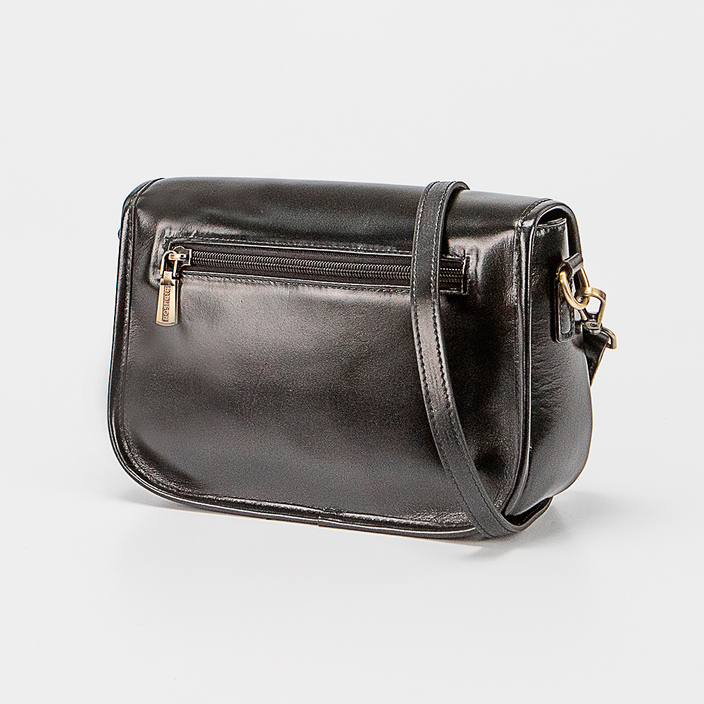 Сумка от торговой марки Poshete из натуральной кожи черного цвета. Модель со съемным регулируемым плечевым ремнем. Закрывается клапаном на магнитной кнопке; клапан декорирован ремешком. Отделение на молнии. Внутри: фирменная подкладка, карман на молнии, накладной карман. На задней стороне – карман на молнии.