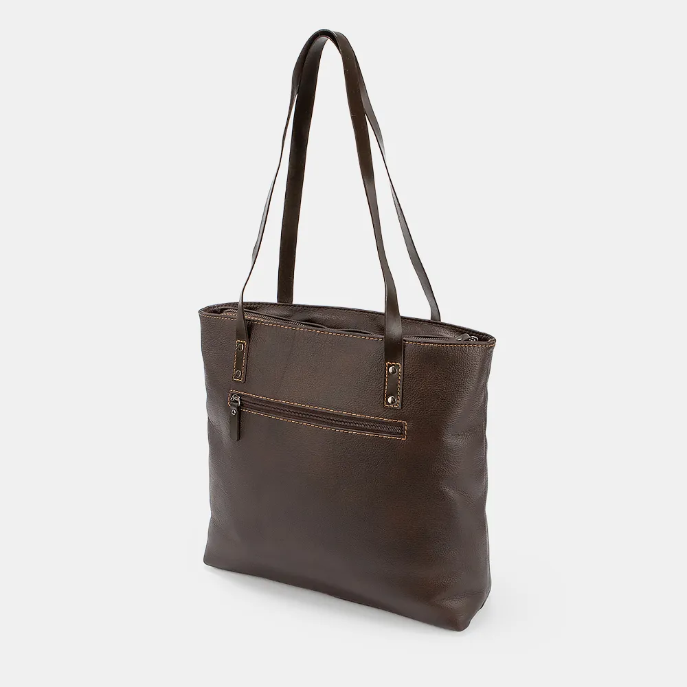 Сумка от торговой марки Poshete из натуральной кожи. Вместительная модель вертикальной ориентации, с двумя удлиненными ручками. Глубокое отделение на молнии. Внутри: фирменная подкладка, карман на молнии, два накладных кармана. На задней стороне – карман на молнии.