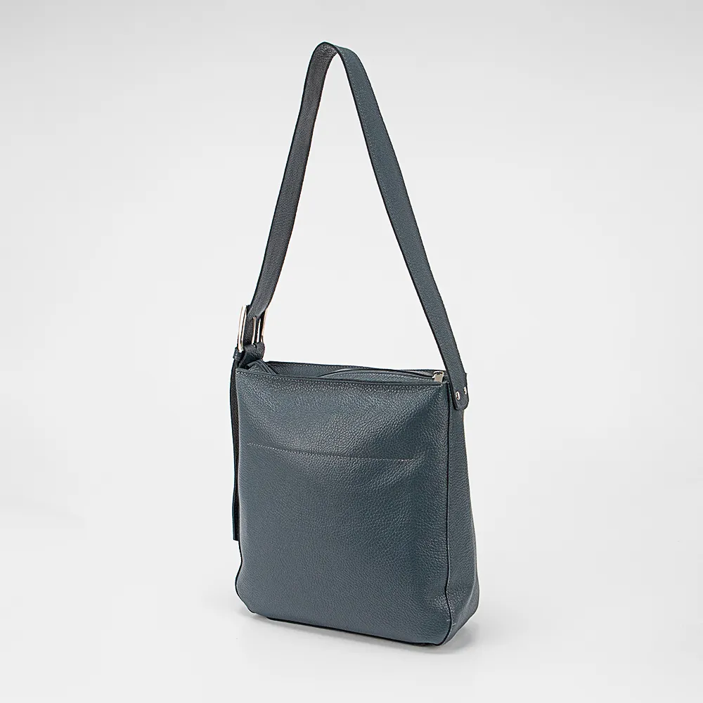 Сумка от торговой марки Francesco Molinary из натуральной кожи синего цвета. Модель вертикальной ориентации с широким несъемным регулируемым плечевым ремнем. Отделение на молнии. Внутри: без подкладки, накладной кожаный карман на молнии.