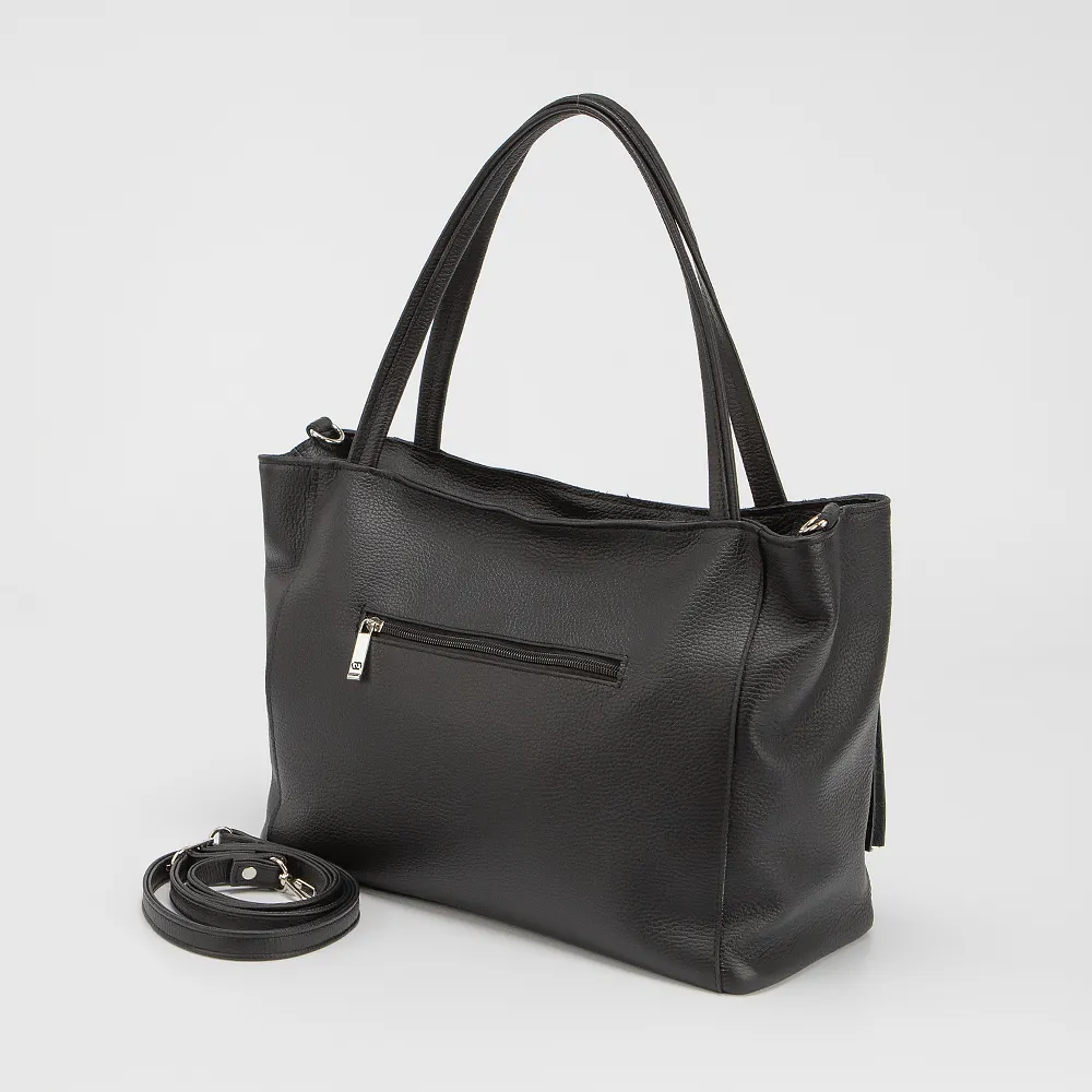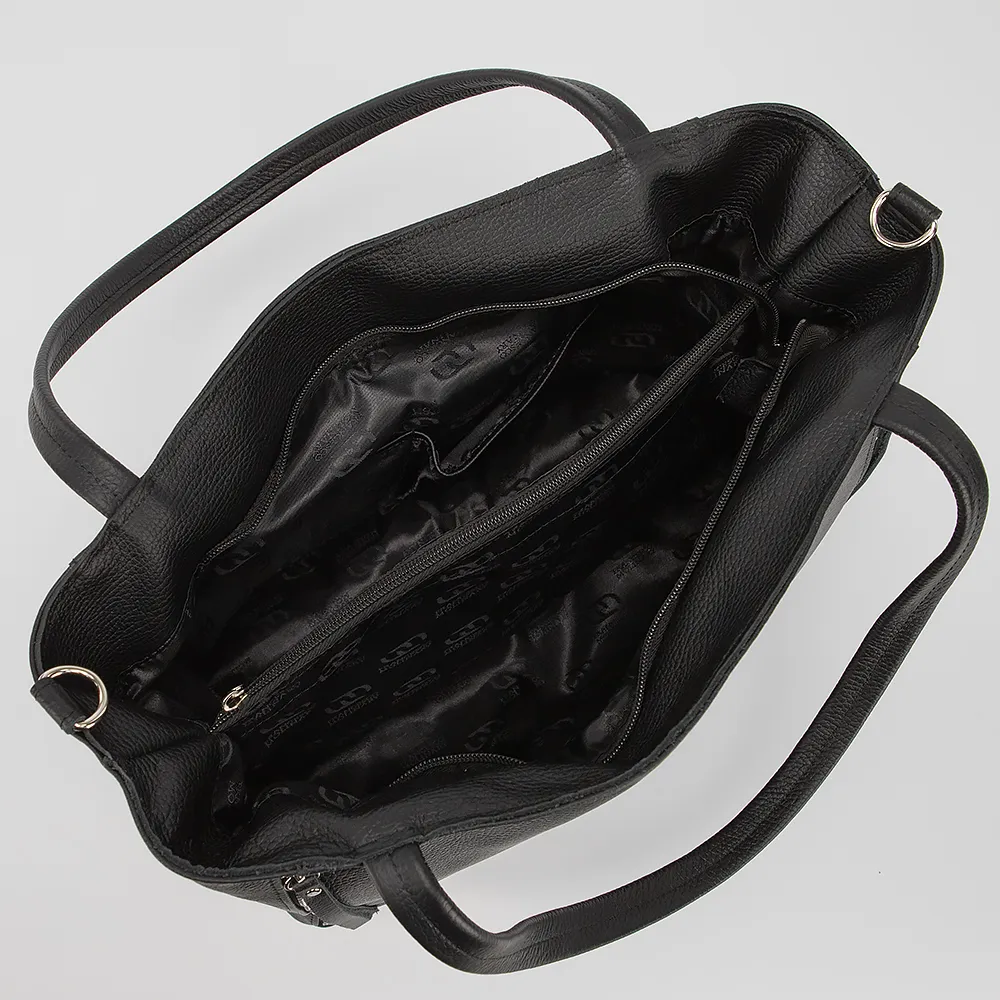 Сумка от торговой марки Francesco Molinary изготовлена из натуральной кожи черного цвета. Модель с двумя удлиненными ручками и съемным регулируемым плечевым ремнем. С лицевой стороны декорирована двумя вертикальными молниями. Отделение на молнии. Внутри: фирменная подкладка, карман и средник на молнии, накладной карман. На задней стороне - карман на молнии.