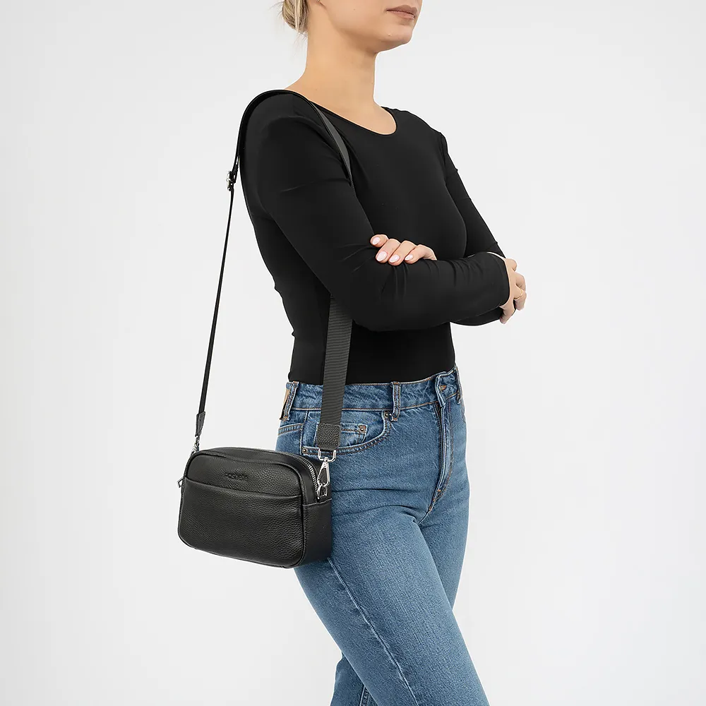 Сумка от торговой марки Poshete из натуральной кожи черного цвета. Компактная модель со съемным регулируемым плечевым ремнем. Отделение на молнии. Внутри: фирменная подкладка, карман на молнии, накладной карман. На лицевой стороне – накладной карман на магнитной кнопке. На задней стороне – карман на молнии.