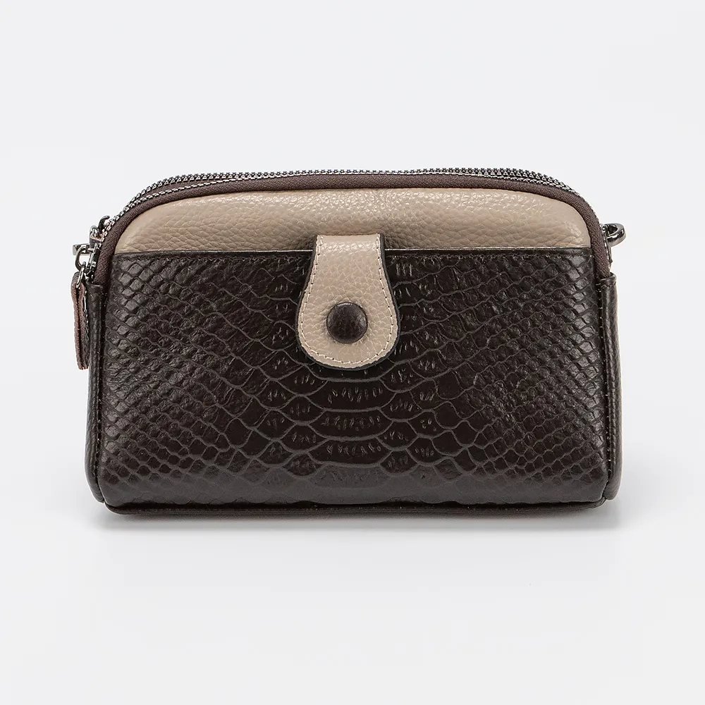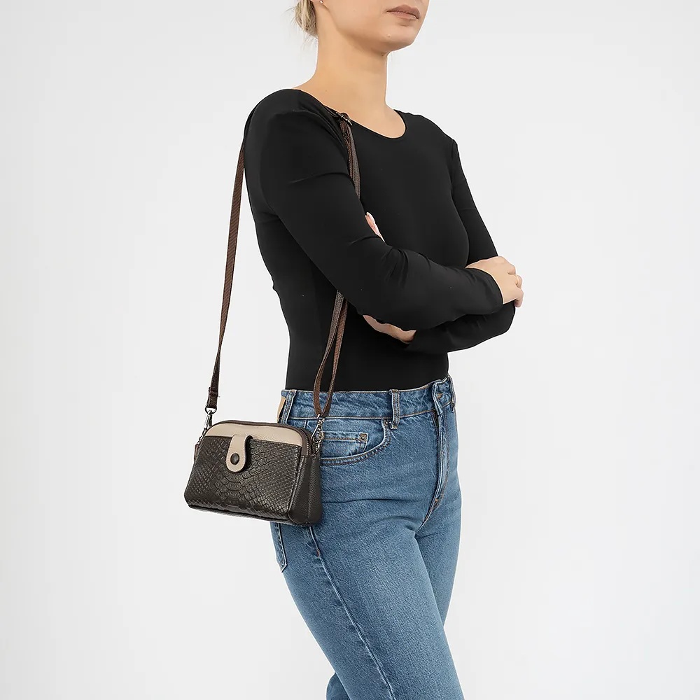 Сумка кросс-боди от торговой марки Poshete из натуральной кожи оттенков коричневого цвета. Компактная небольшая модель со съемным регулируемым плечевым ремнем. Два отделения на молнии, с фирменной подкладкой. В заднем – карман на молнии, в переднем – накладной карман. На лицевой стороне – накладной карман с хлястиком на кнопке. На задней стороне – карман на молнии.