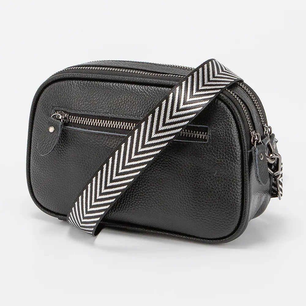 Сумка от торговой марки Poshete из натуральной кожи чёрного цвета. Модель с широким съемным регулируемым плечевым ремнем, выполненным из текстильного материала с оригинальным орнаментом. Два отделения на молнии, с фирменной подкладкой. В заднем отделении – карман на молнии. На задней стороне – карман на молнии.