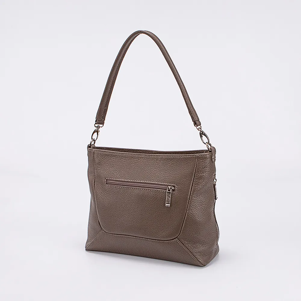 Сумка от торговой марки Francesco Molinary из натуральной кожи кофейного цвета. Модель с удлиненной съемной ручкой и съемным регулируемым плечевым ремнем. Отделение на молнии. Внутри: фирменная подкладка, карман на молнии, два накладных кармана. На задней стороне – карман на молнии.
