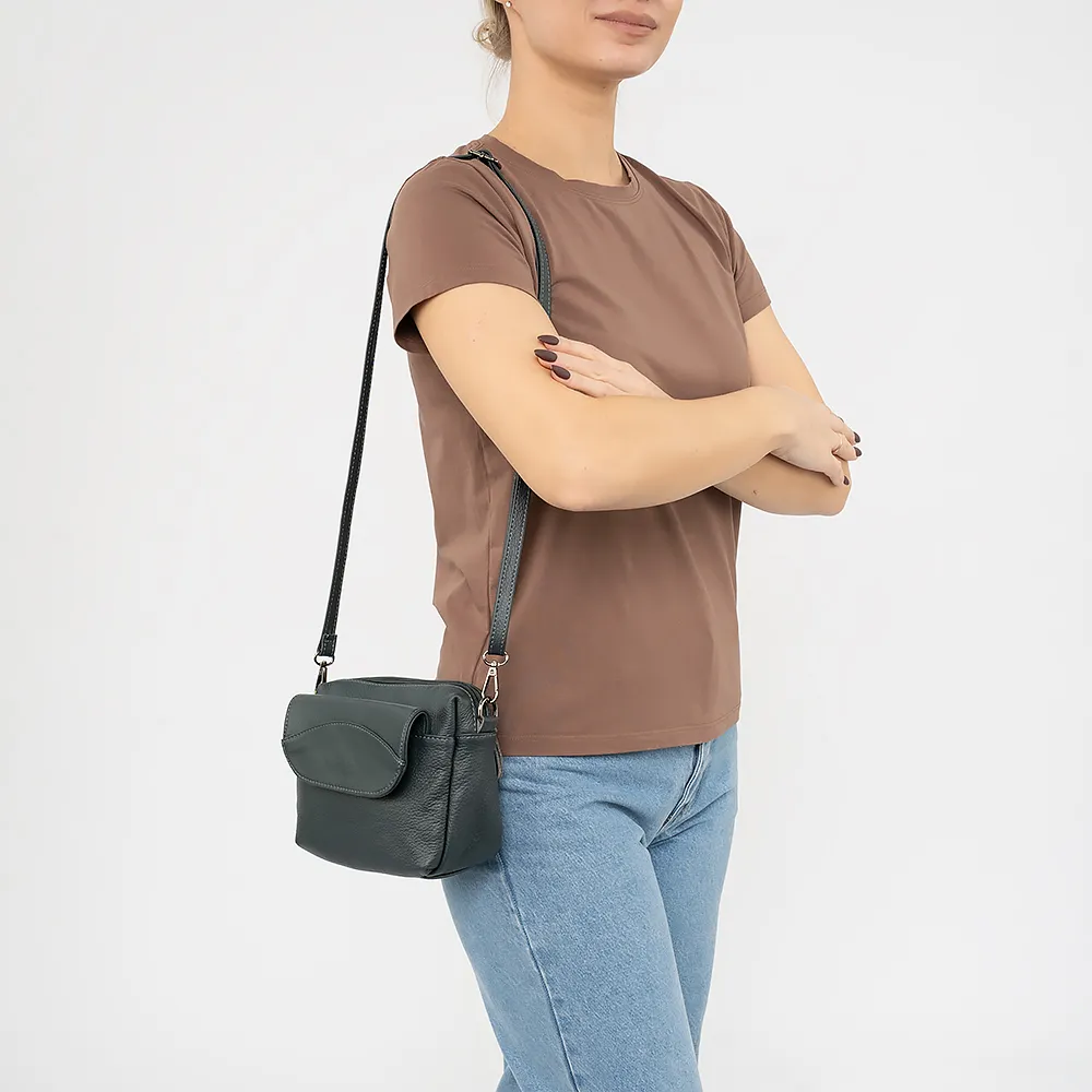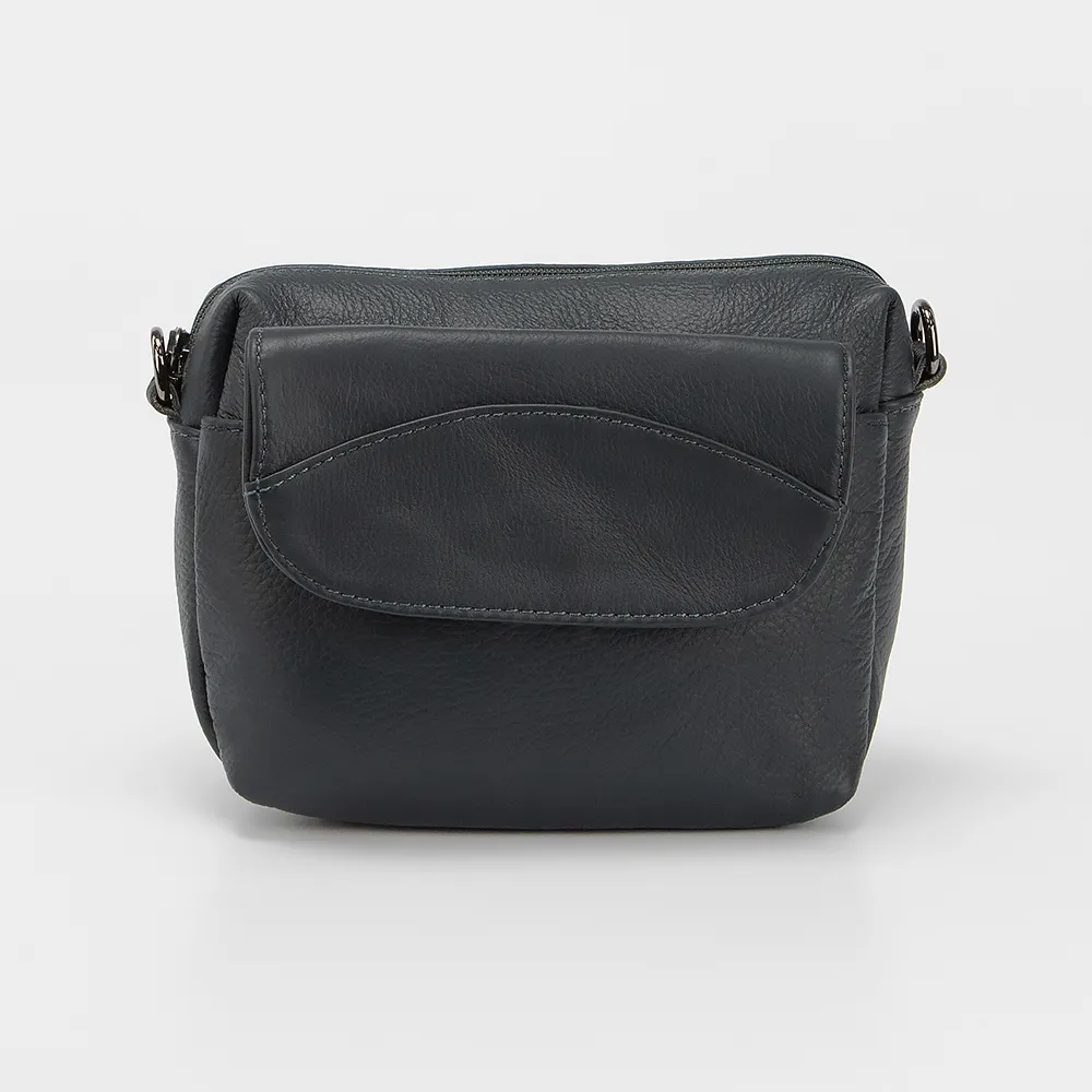 Сумка от торговой марки Poshete из натуральной кожи темно-синего цвета. Модель со съемным регулируемым плечевым ремнем. Отделение на молнии. Внутри: текстильная подкладка, карман на молнии. На лицевой стороне - накладной карман с клапаном. На задней стороне - карман на молнии.