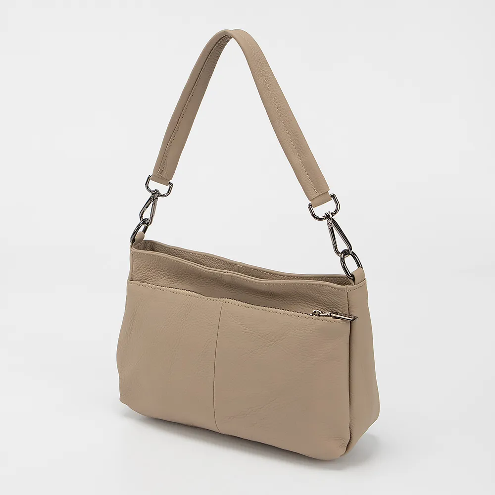 Сумка от торговой марки Poshete из натуральной кожи бежевого цвета. Модель с длинной съемной ручкой . Отделение на молнии. Внутри: текстильная подкладка, карман на молнии. На лицевой и задней стороне - накладной карман на молнии.