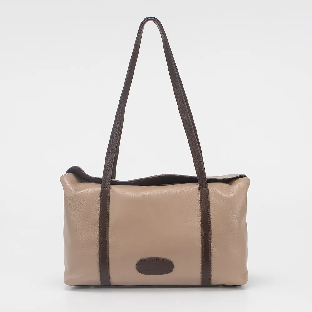 Сумка от торговой марки Poshete из натуральной кожи бежевого цвета. Компактная модель с удлиненными ручками темно-коричневого цвета. Внутри: фирменная подкладка, карман на молнии, накладной карман. На задней стороне - карман на молнии. Дно оснащено металлическими ножками для защиты от износа.