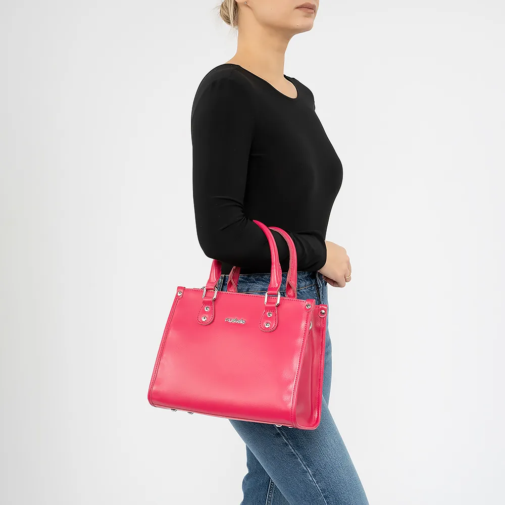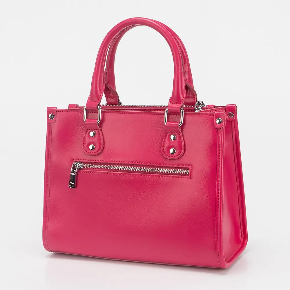 Сумка от торговой марки Poshete из натуральной кожи розового цвета. Компактная модель с двумя плотными ручками и съемным регулируемым плечевым ремнем. Отделение на молнии. Внутри: текстильная подкладка, средник и карман на молнии, накладной карман. На задней стороне - карман на молнии. Дно оснащено металлическими ножками для защиты от износа.