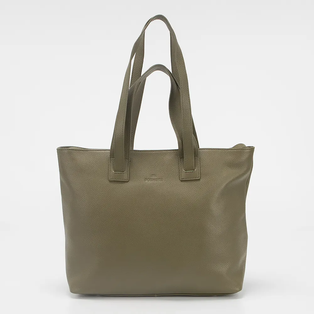 Сумка от торговой марки Poshete из натуральной кожи оливкового цвета. Модель с двумя длинными и двумя короткими ручками. Отделение на молнии и на магнитной кнопке. Дополнительно предусмотрены тонкие ремешки на кнопке для придания оригинальной формы сумке. Внутри: фирменная подкладка, карман на молнии, накладной карман. Сзади карман на молнии. Дно оснащено металлическими ножками для защиты от износа.
