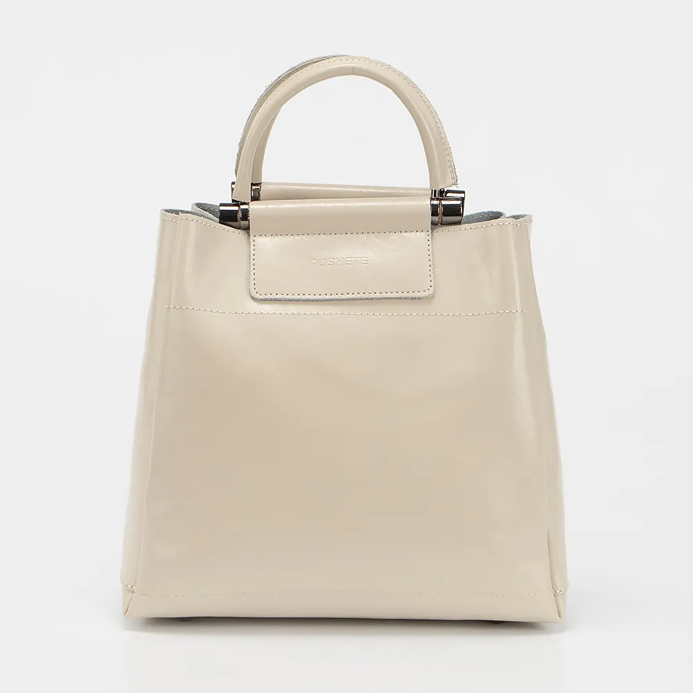 Сумка от торговой марки Poshete из натуральной кожи бежевого цвета. Модель с двумя ручками и съемным регулируемым плечевым ремнем. Основное отделение на молнии, боковые - на магнитной кнопке. Внутри: частичная текстильная подкладка, карман на молнии, накладной карман. На задней стороне - карман на молнии. Дно оснащено металлическими ножками для защиты от износа.
