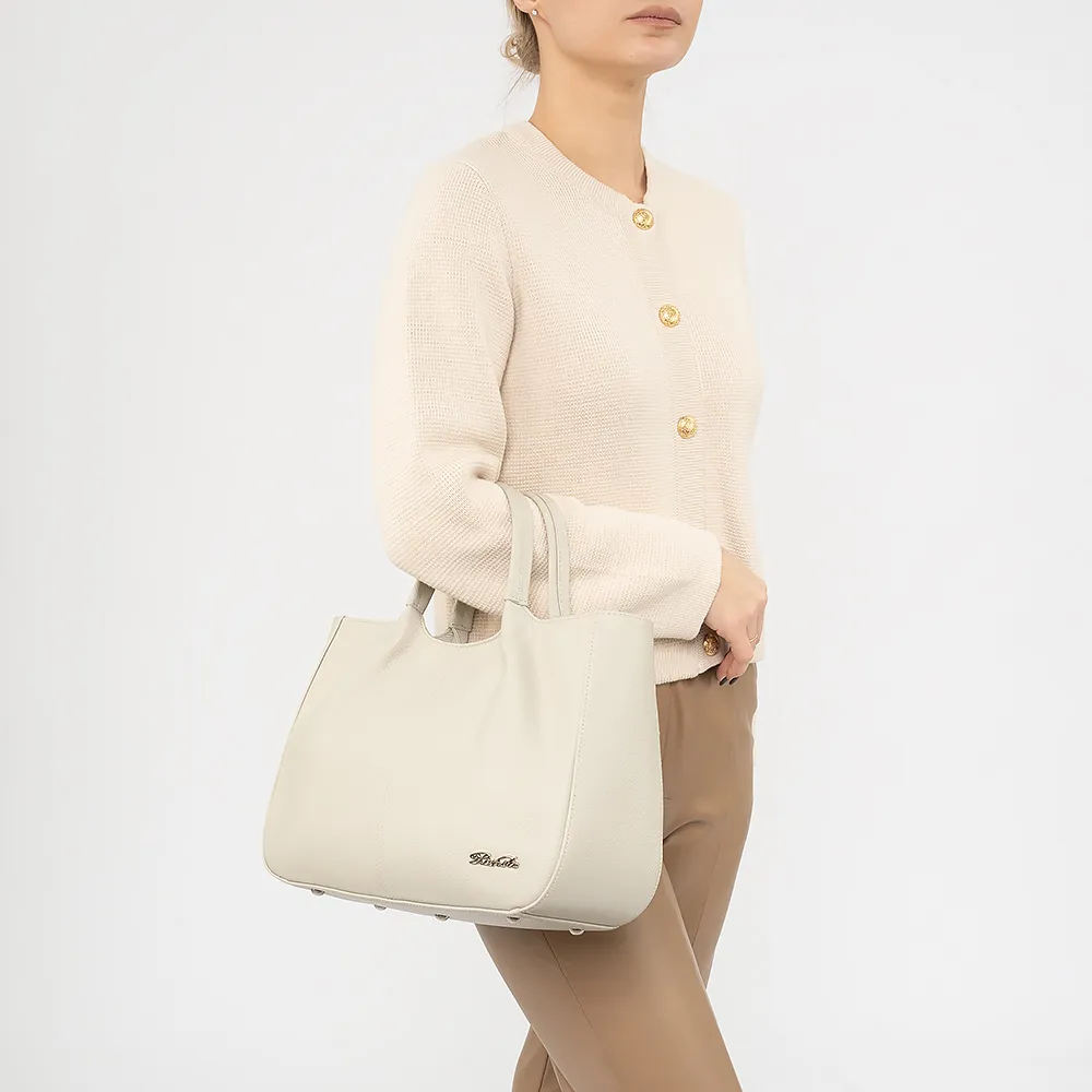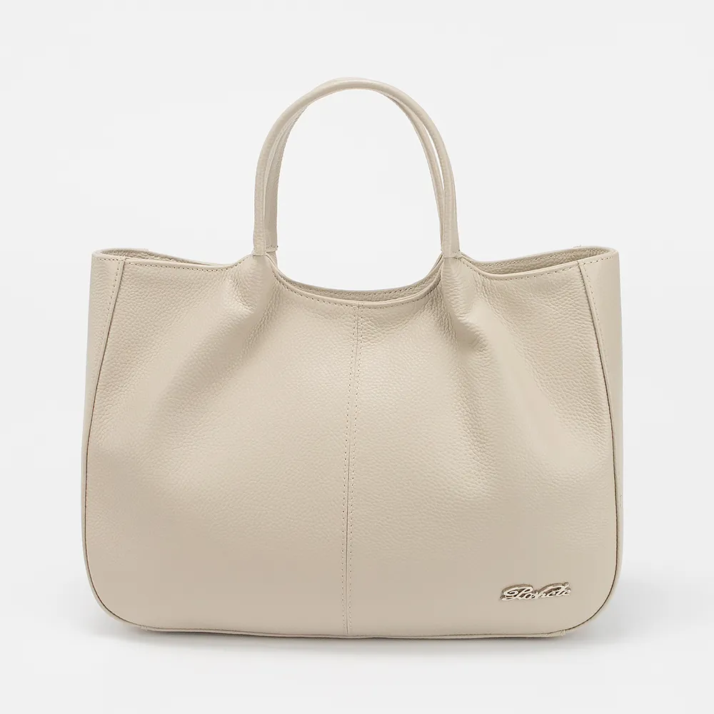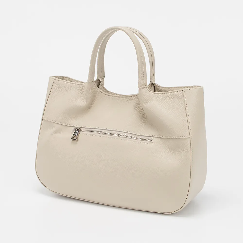 Сумка от торговой марки Poshete из натуральной кожи бежевого цвета. Модель с двумя ручками и съемным регулируемым плечевым ремнем. Отделение на молнии. Внутри: текстильная подкладка, карман и средник на молнии, накладной карман. На задней стороне - карман на молнии. Дно оснащено металлическими ножками для защиты от износа.