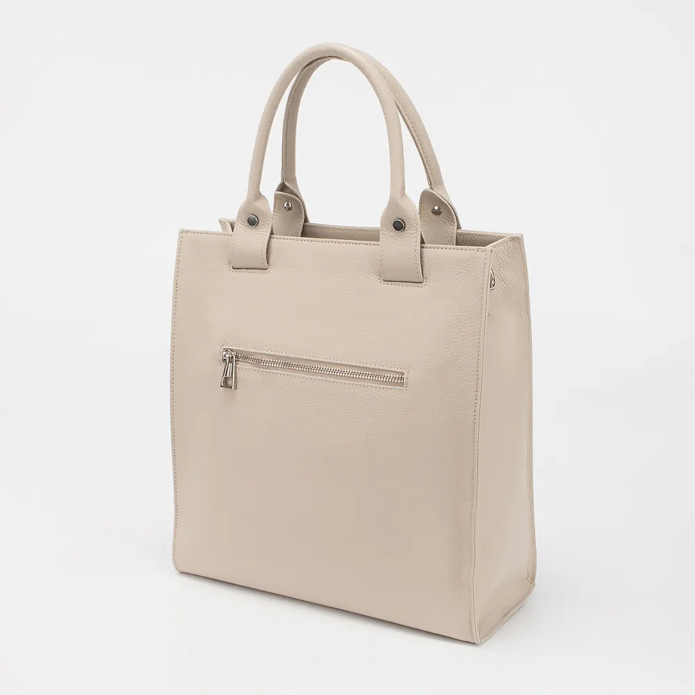 Сумка от торговой марки Poshete из натуральной кожи светло-серого цвета. Модель вертикальной ориентации с двумя ручками и съемным регулируемым плечевым ремнем. Отделение на молнии. Внутри: фирменная подкладка, карман на молнии, накладной карман. На задней стороне - карман на молнии. Дно оснащено металлическими ножками для защиты от износа