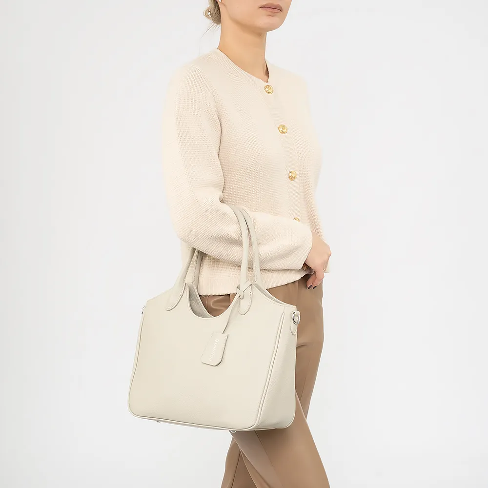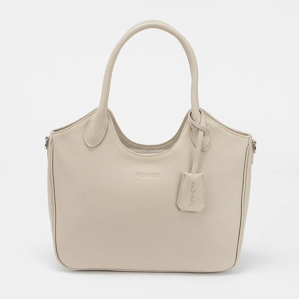 Сумка от торговой марки Poshete из натуральной кожи бежевого цвета. Модель с двумя длинными ручками и съемным регулируемым плечевым ремнем. Декорирована подвеской из натуральной кожи. Отделение на молнии. Внутри: фирменная подкладка, карман и средник на молнии, накладной карман. Дно оснащено металлическими ножками для защиты от износа.