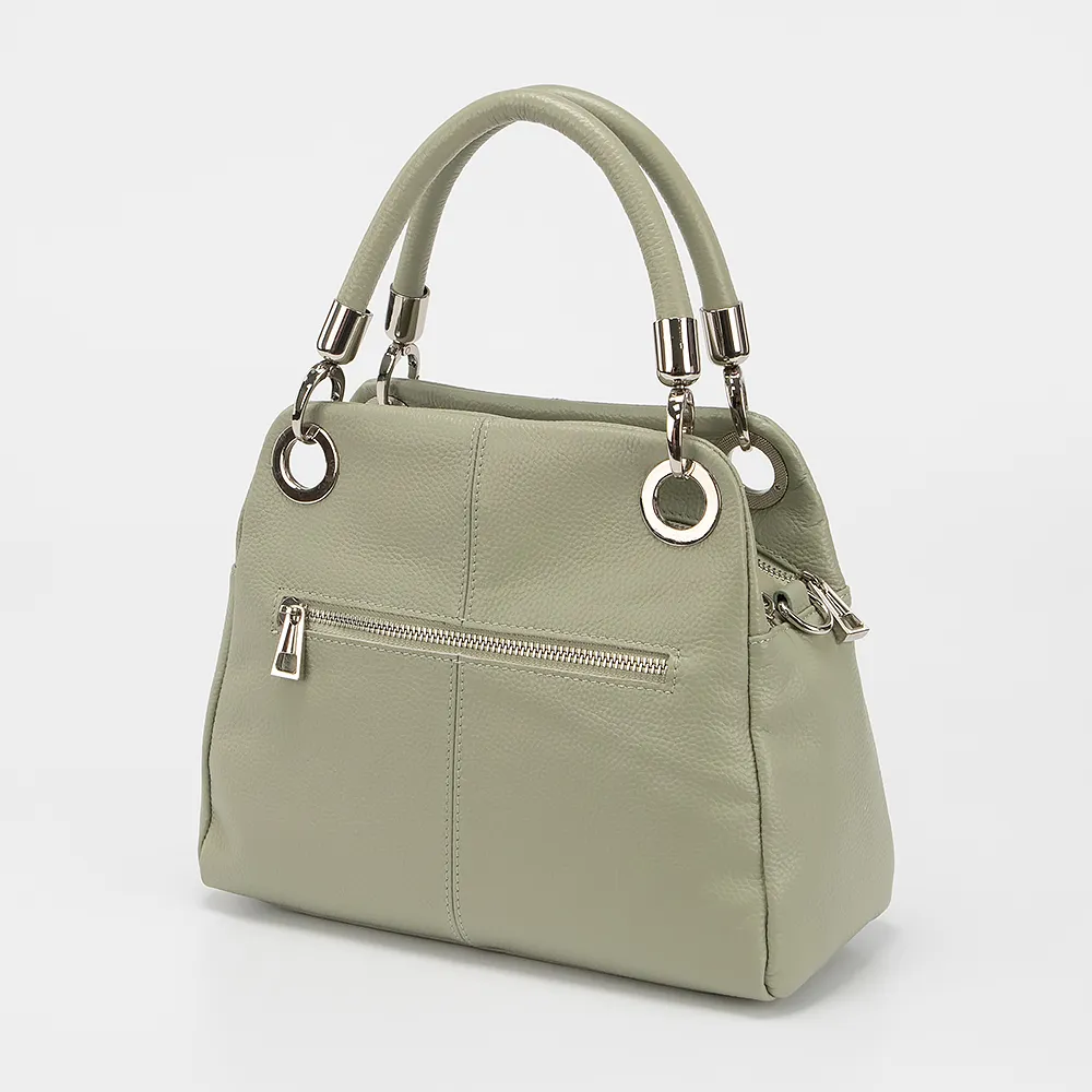 Сумка от торговой марки Poshete из натуральной кожи зеленого цвета. Модель среднего размера с двумя плотными ручками на люверсах и съемным регулируемым плечевым ремнем. Два отделения на молнии, с фирменной подкладкой. В заднем - карман на молнии, в переднем - два накладных кармана. На задней стороне - карман на молнии.