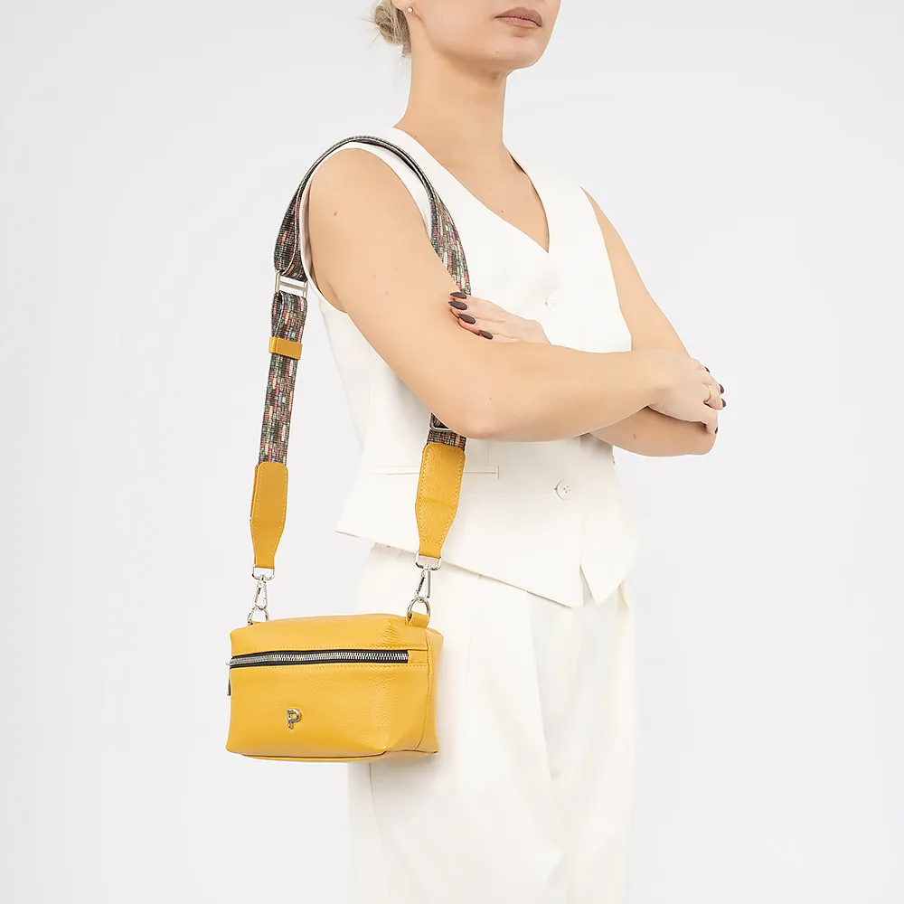 Сумка от торговой марки Poshete из натуральной кожи желтого цвета. Компактная модель со съемным регулируемым плечевым ремнем, выполненным из текстильного материала с оригинальным рисунком. Отделение на молнии. Внутри: фирменная подкладка, карман на молнии, накладной карман. На лицевой и задней сторонах - карман на молнии.