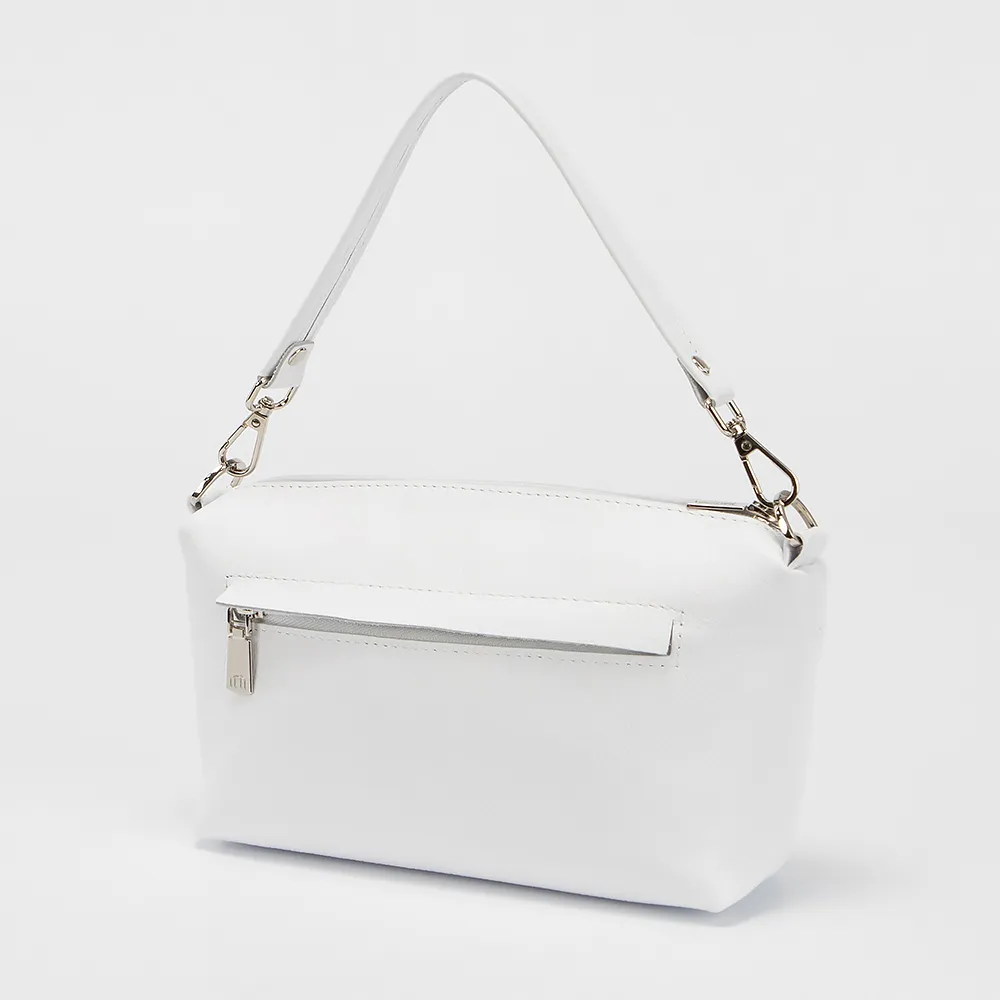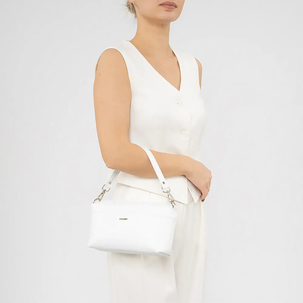 Сумка кросс-боди от торговой марки Poshete из натуральной кожи белого цвета. Модель со съемной ручкой, съемным ремешком на запястье и съемным регулируемым плечевым ремнем. Отделение на молнии. Внутри: карман на молнии, накладной карман. На задней стороне - карман на скрытой молнии.