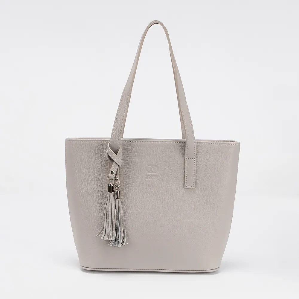 Сумка от торговой марки Francesco Molinary из натуральной кожи серого цвета. Модель с двумя удлиненными ручками, декорированными подвеской с кисточками. Отделение на молнии. Внутри: фирменная подкладка, средник и карман на молнии. На задней стороне - карман на молнии. Дно оснащено металлическими ножками для защиты от износа.