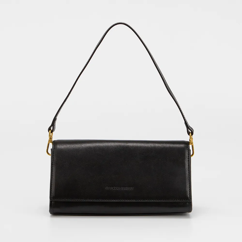Сумка от торговой марки Francesco Molinary выполнена из натуральной кожи черного цвета. Модель с длинной съемной ручкой и длинным регулируемым плечевым ремнем. Клапан на скрытых магнитах закрывает отделение на молнии. Внутри: текстильная подкладка.