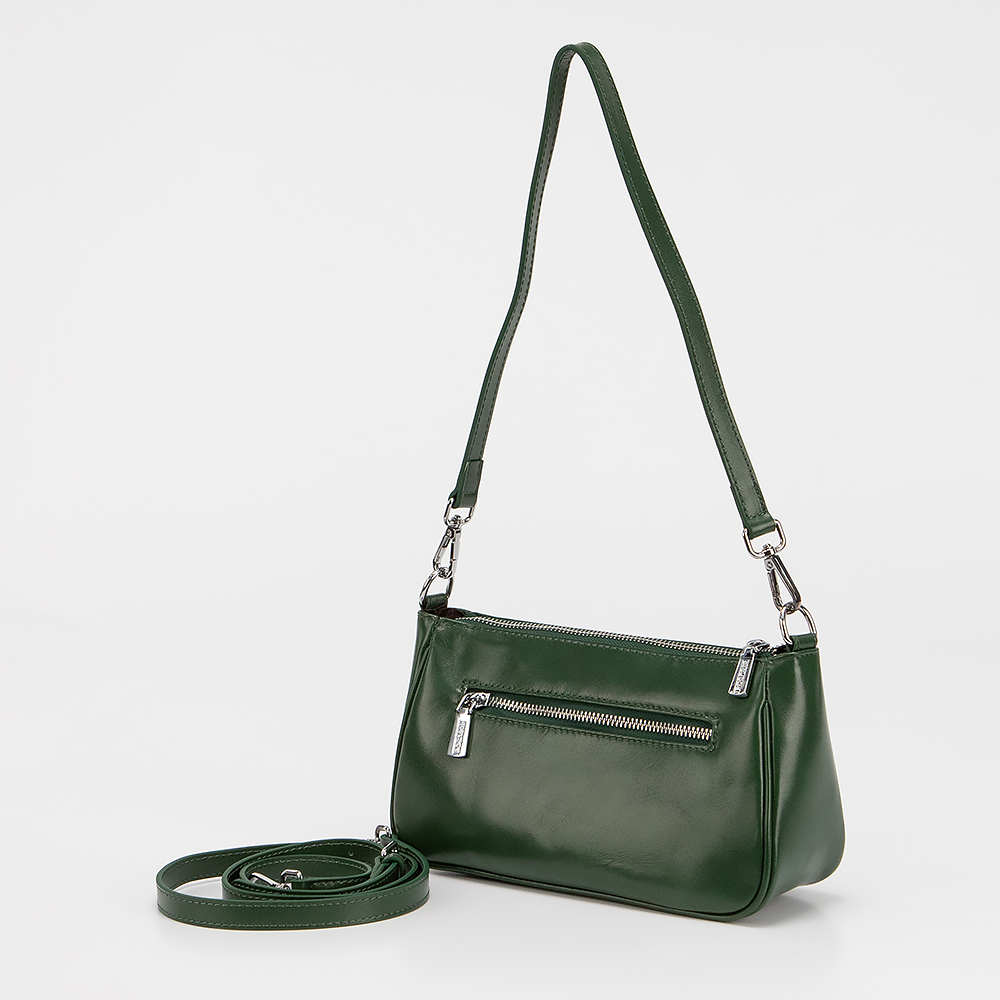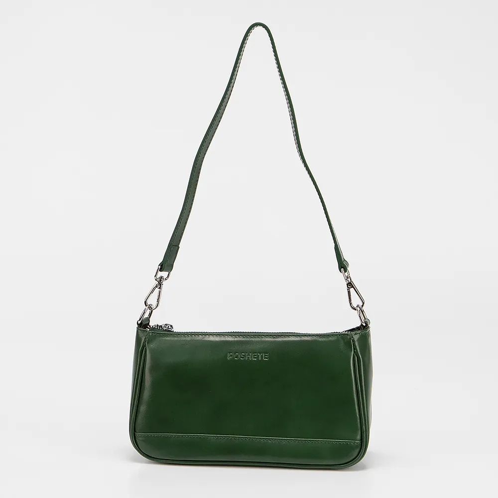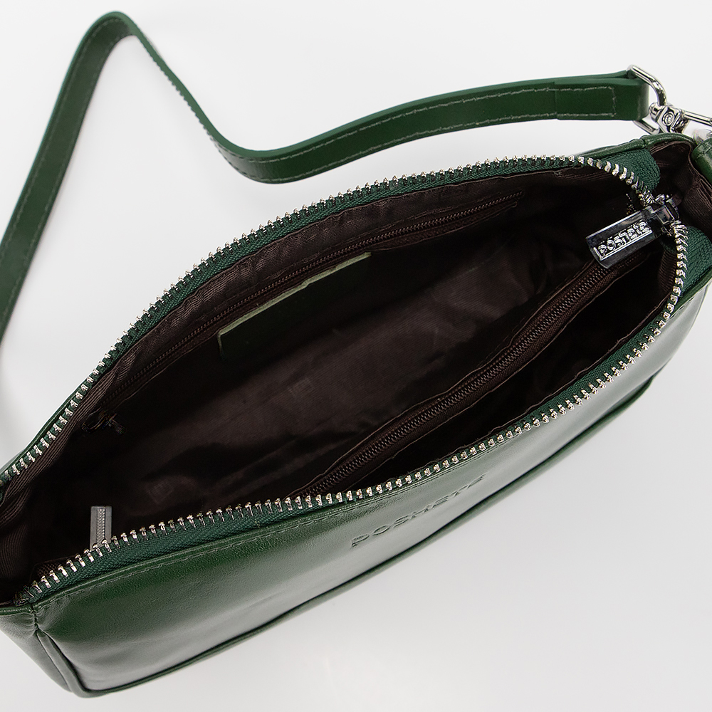 Сумка от торговой марки Poshete выполнена из натуральной кожи зеленого цвета. Модель с длинной ручкой и длинным регулируемым плечевым ремнем. Отделение на молнии. Внутри: текстильная подкладка, карман и средник на молнии, накладной карман. На задней стороне - карман на молнии.