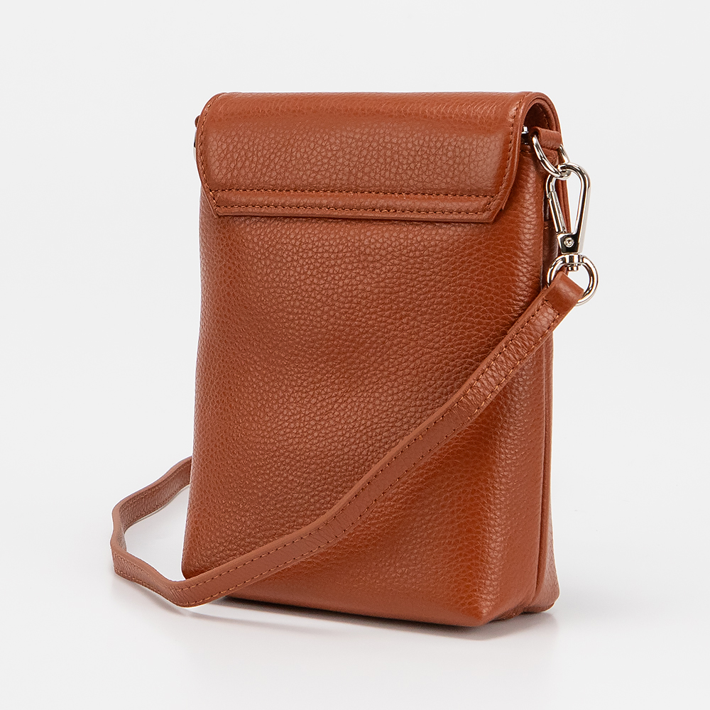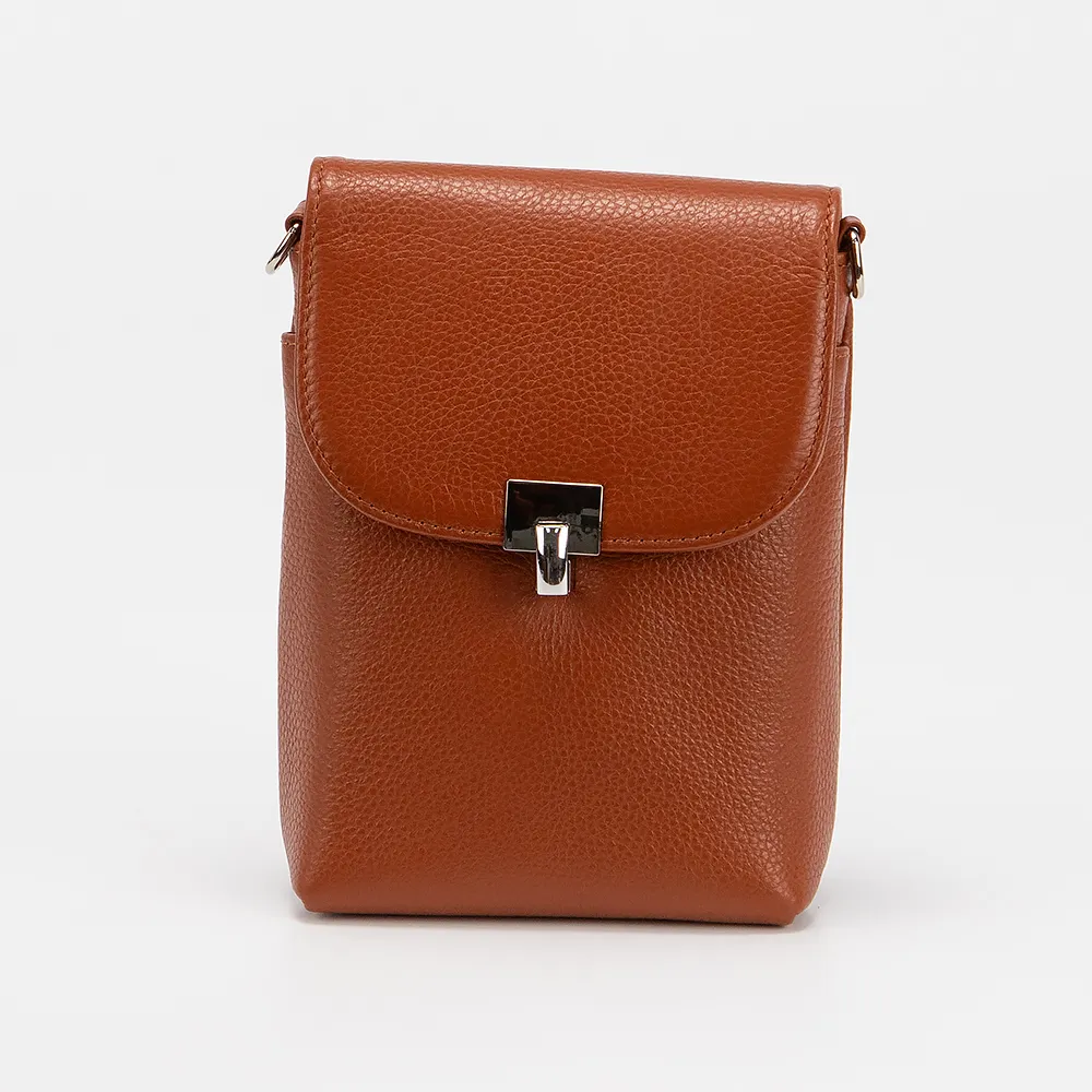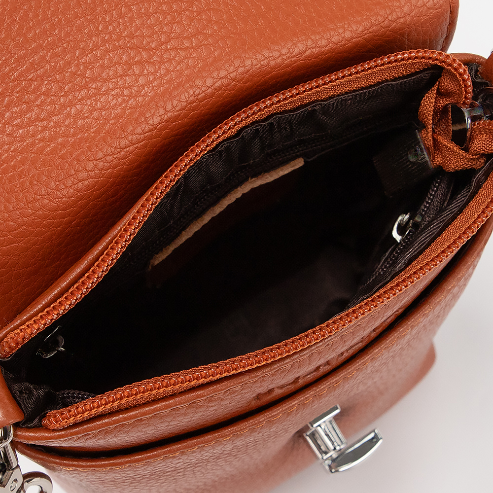 Сумка от торговой марки Poshete выполнена из натуральной кожи коричневого цвета. Компактная модель вертикальной ориентации с длинным регулируемым плечевым ремнем. Клапан на поворотном замке закрывает отделение на молнии. Внутри: текстильная подкладка, два кармана на молнии.