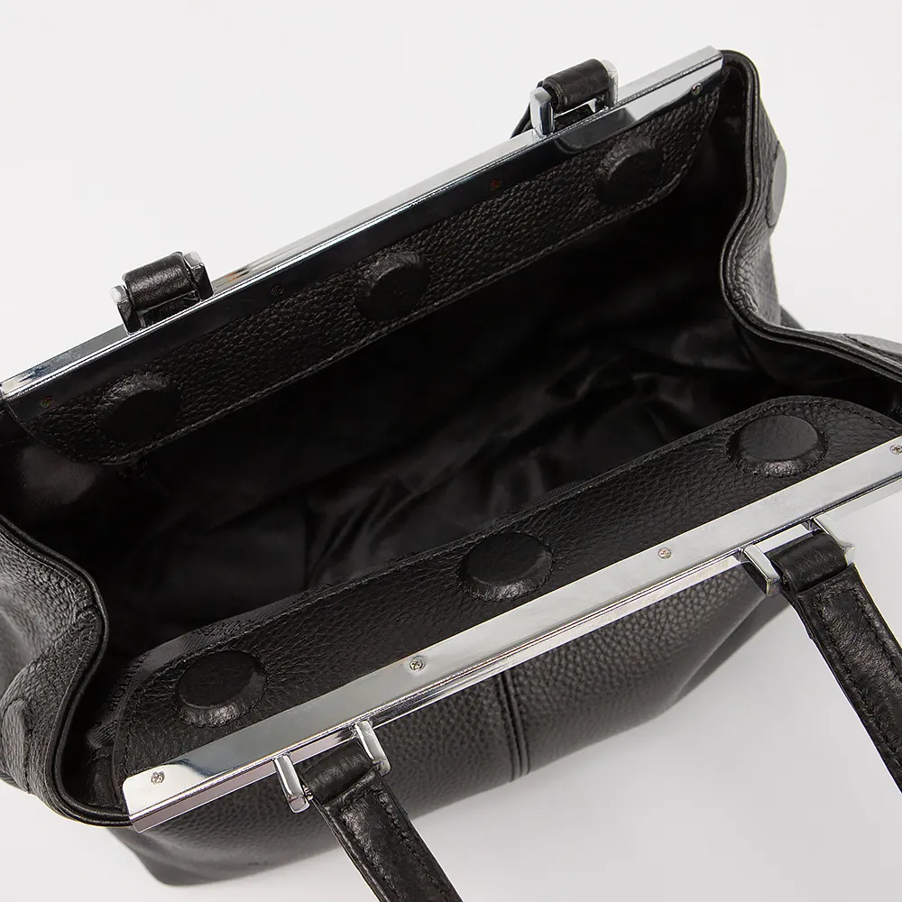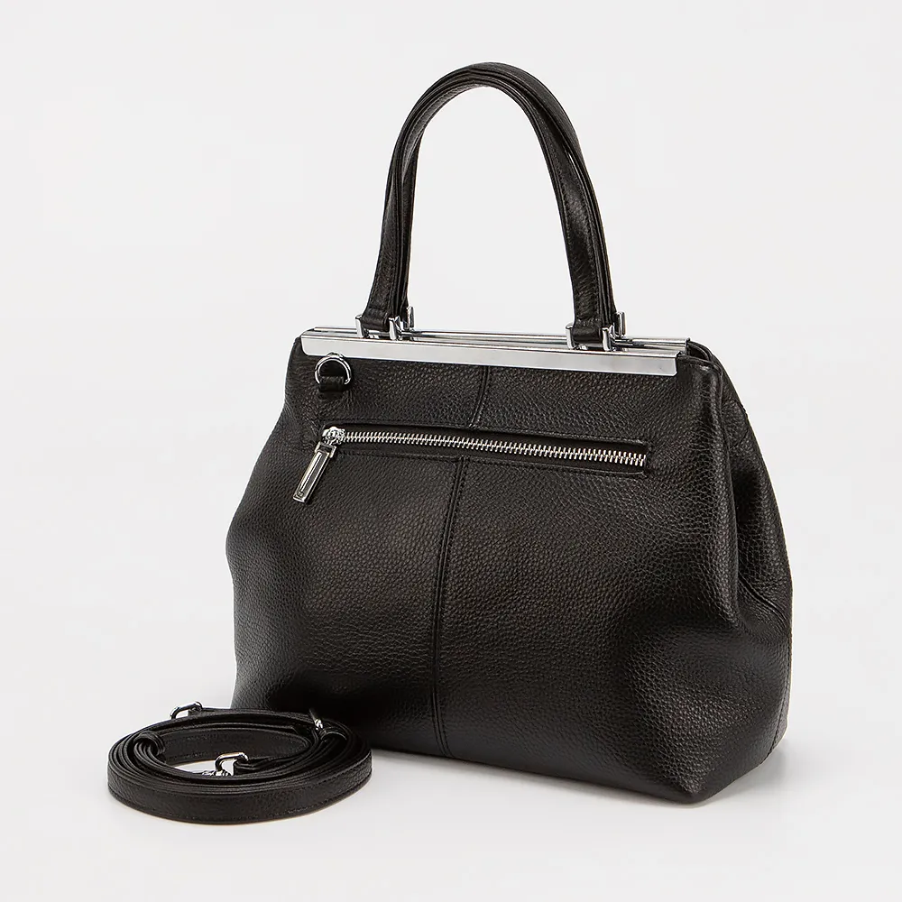 Сумка от торговой марки Francesco Molinary выполнена из натуральной зернистой кожи черного цвета. Модель с двумя ручками и съемным регулируемым плечевым ремнем. Отделение закрывается тремя скрытыми магнитами. Внутри: текстильная подкладка, карман на молнии, накладной карман. На задней стороне - карман на молнии.
