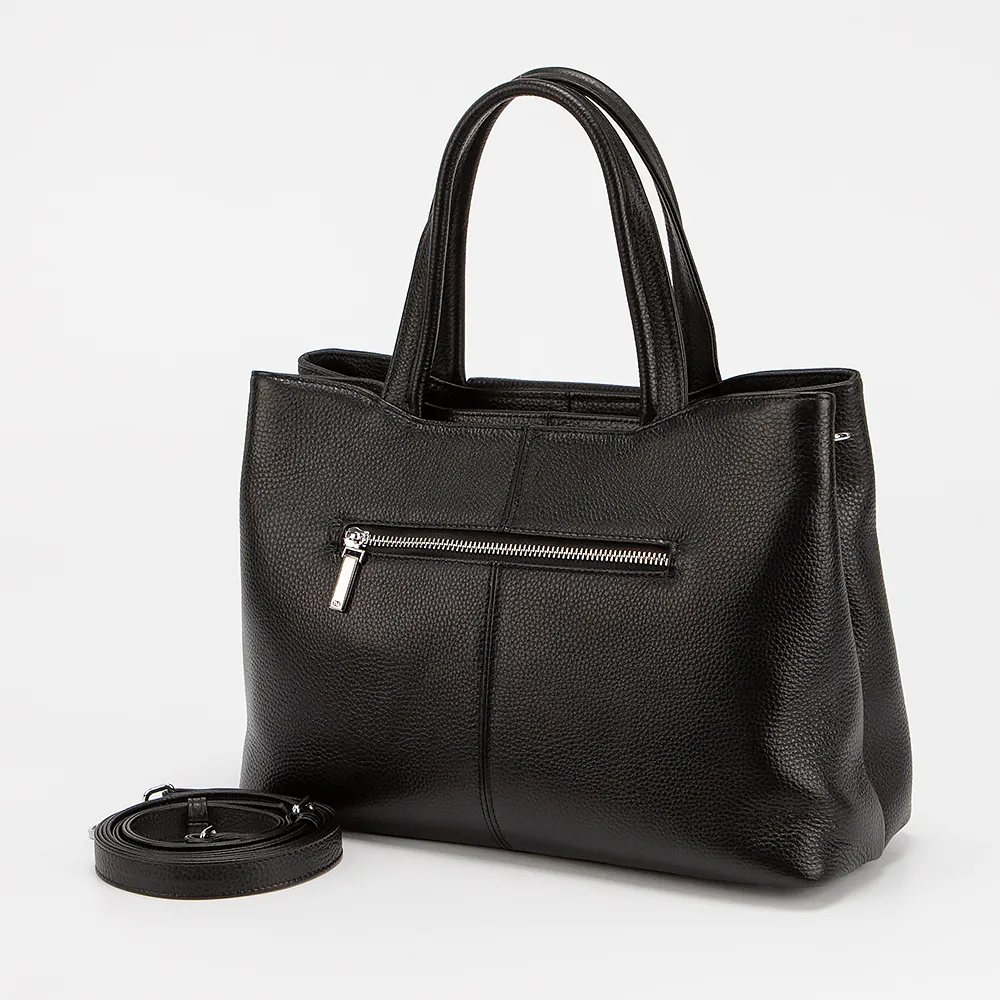Сумка от торговой марки Francesco Molinary выполнена из натуральной кожи черного цвета. Модель с двумя ручками и длинным регулируемым плечевым ремнем. Два отделения на молнии. Внутри: текстильная подкладка, карман на молнии, накладной карман. С задней стороны - карман на молнии.