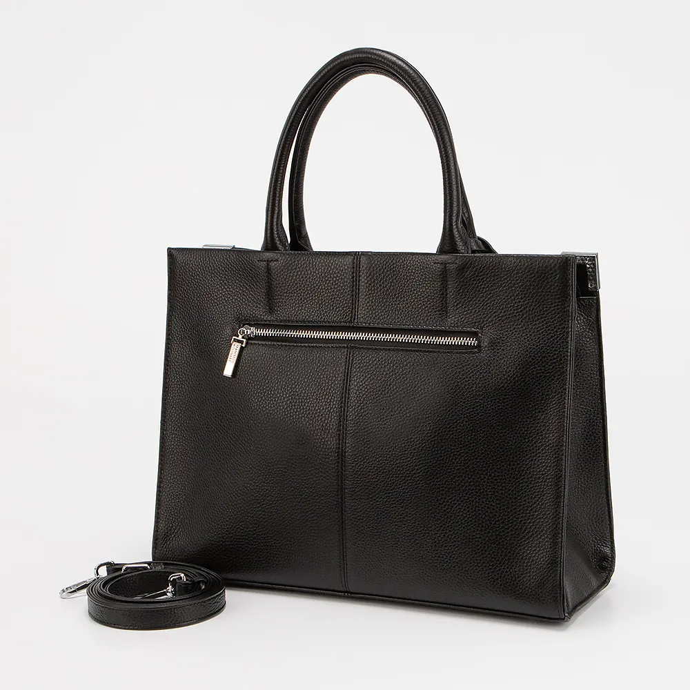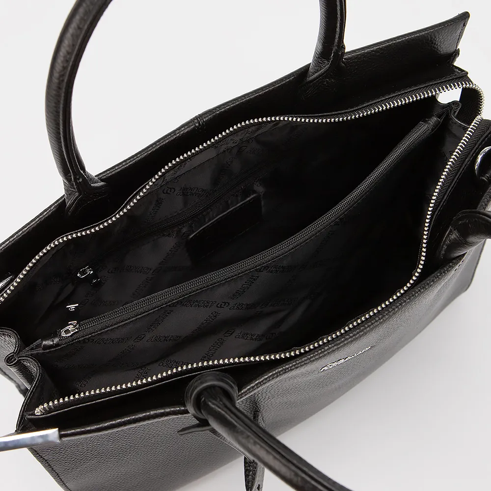 Сумка от торговой марки Francesco Molinary выполнена из натуральной кожи черного цвета. Модель с двумя ручками и съемным регулируемым плечевым ремнем. Декорирована подвеской и защитными металлическими уголками для защиты от износа. Отделение на молнии. Внутри: текстильная подкладка, карман и средник на молнии, накладной карман. С задней стороны - карман на молнии.