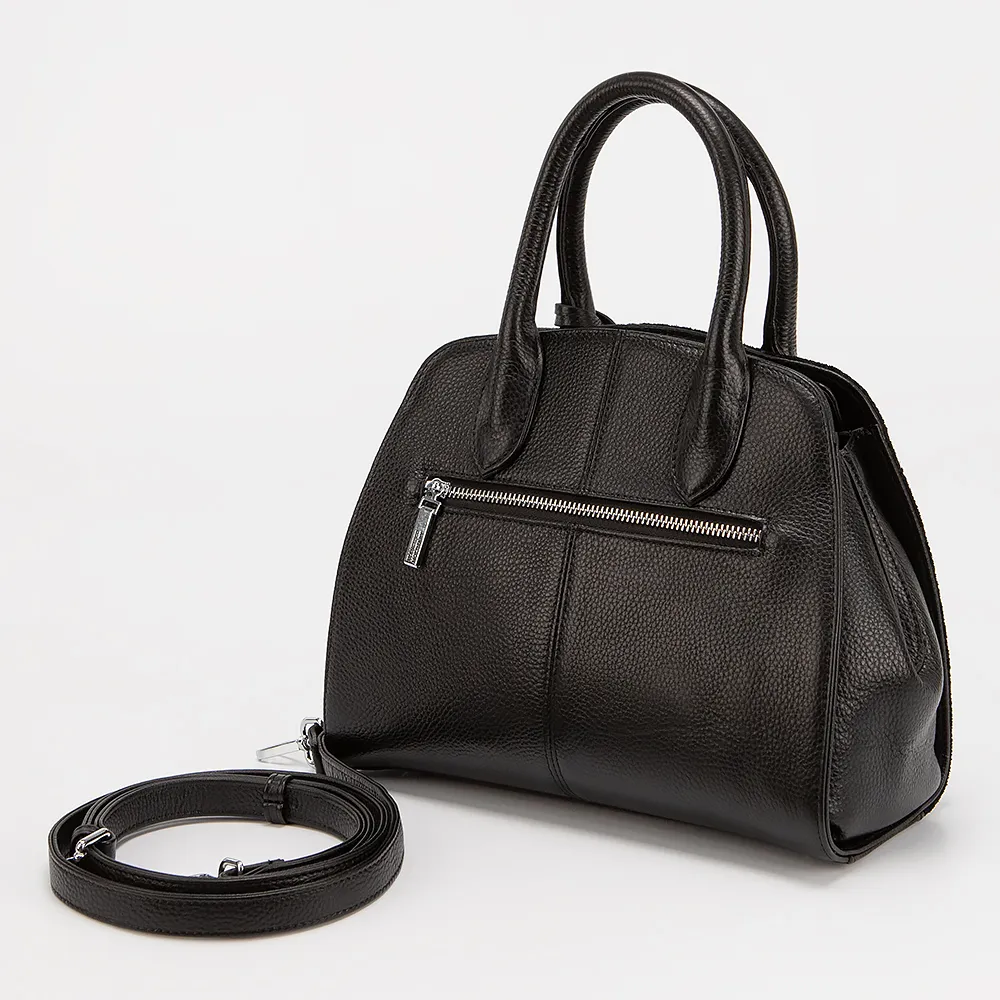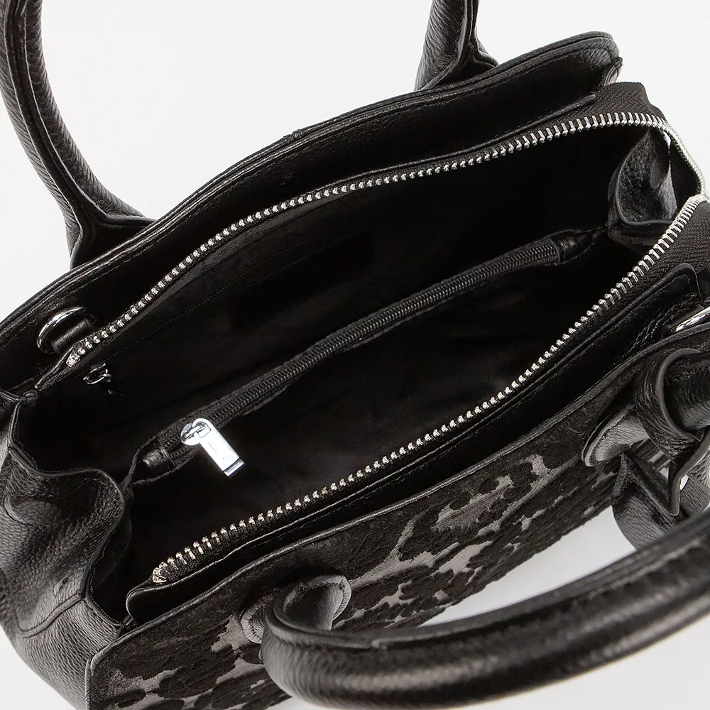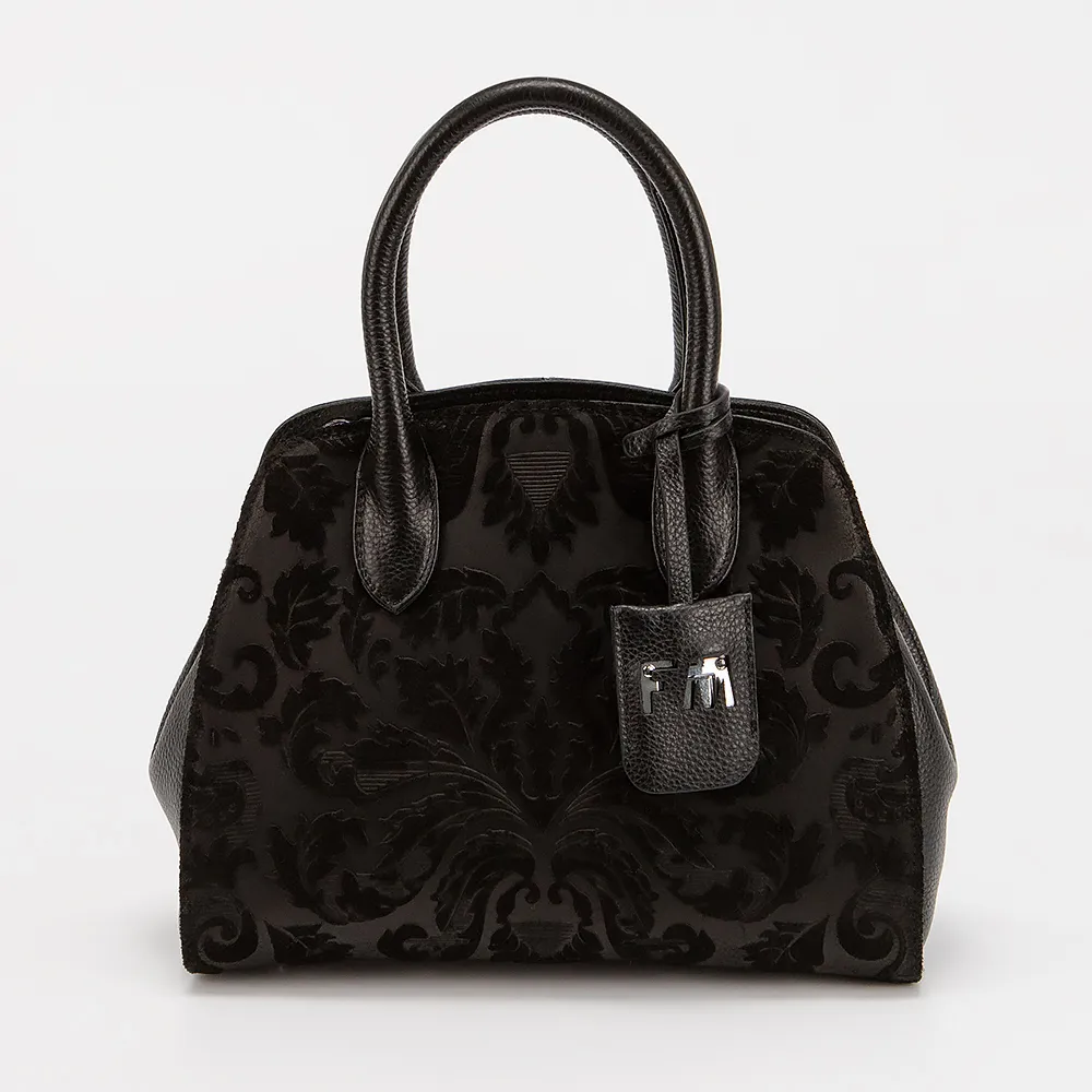 Сумка от торговой марки Francesco Molinary выполнена из натуральной кожи черного цвета. Модель с двумя ручками и съемным регулируемым плечевым ремнем. С лицевой стороны декорирована замшевым цветочным тиснением. Отделение на молнии. Внутри: текстильная подкладка, карман и средник на молнии, накладной карман. С задней стороны - карман на молнии.