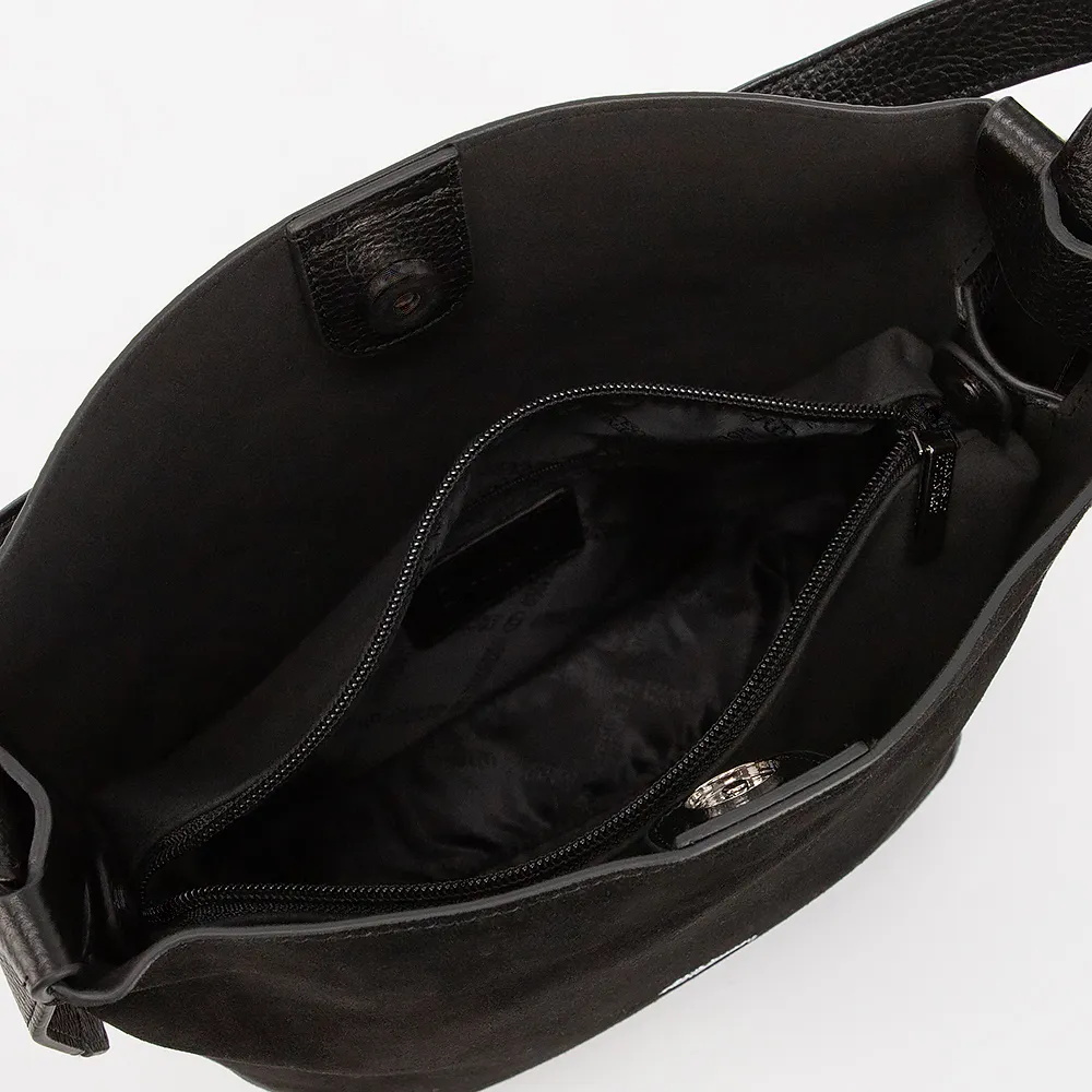 Сумка от торговой марки Francesco Molinary выполнена из натуральной кожи и замши черного цвета. Модель с длинной ручкой и съемным плечевым ремнем. Отделение на магнитной кнопке. Внутри: без подкладки, имеется вкладыш на молнии из текстильного материала.