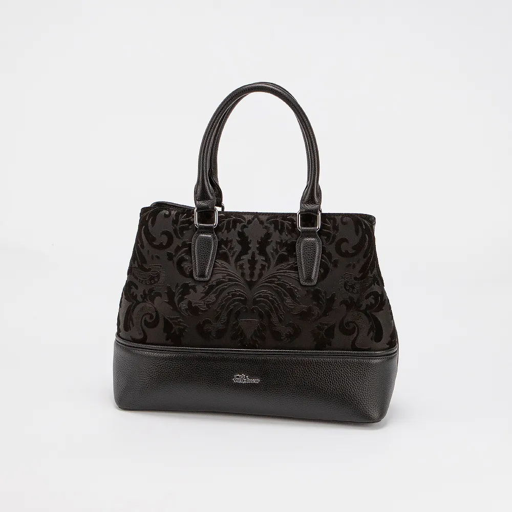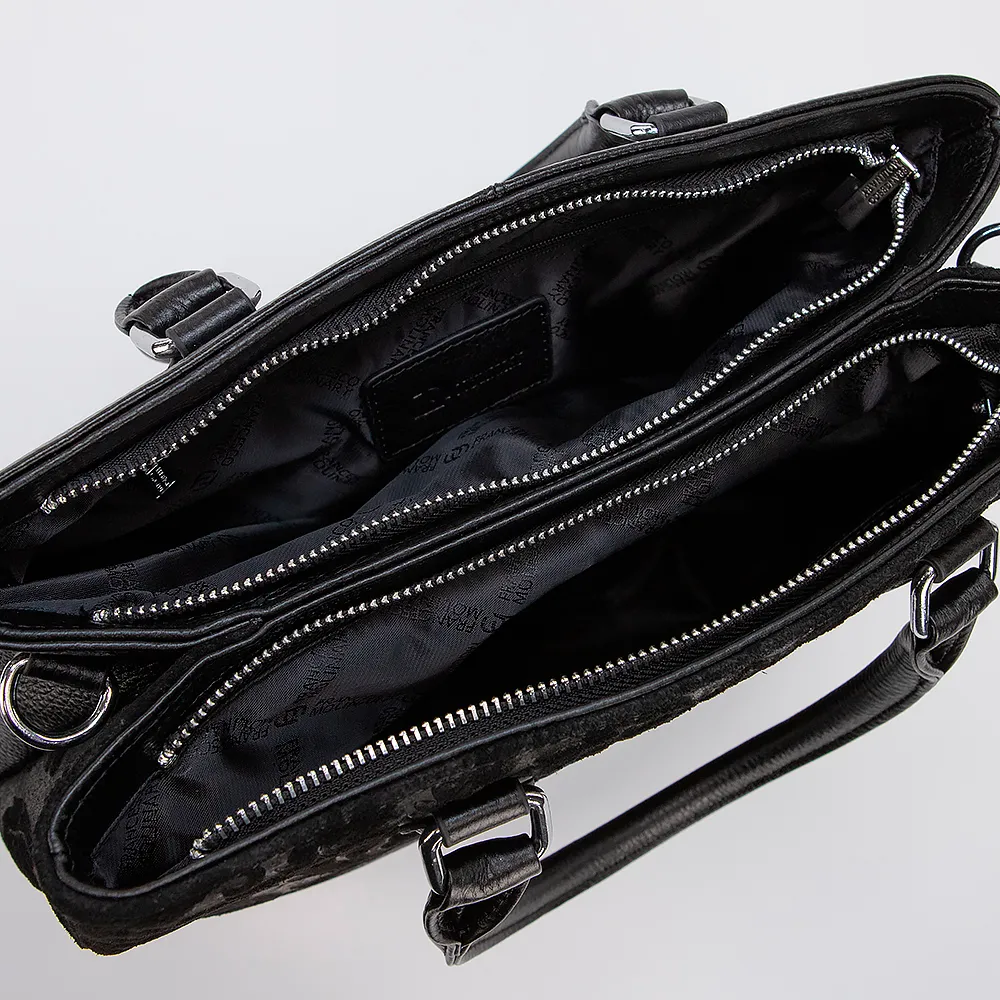Сумка от торговой марки Francesco Molinary выполнена из натуральной кожи черного цвета. Модель с двумя ручками и съемным регулируемым плечевым ремнем. С лицевой стороны декорирована замшевым цветочным тиснением. Два отделения на молнии. Внутри: текстильная подкладка, карман и средник на молнии, накладной карман. С задней стороны - карман на молнии.