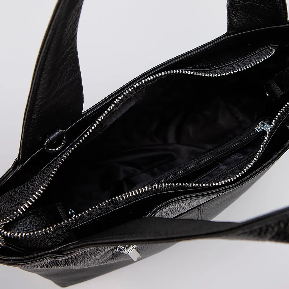 Сумка от торговой марки Francesco Molinary выполнена из натуральной кожи черного цвета. Модель с двумя широкими ручками и длинным регулируемым плечевым ремнем. Отделение на молнии. Внутри: текстильная покладка, карман на молнии, накладной карман. Дно оснащено металлическими ножками для защиты от износа.