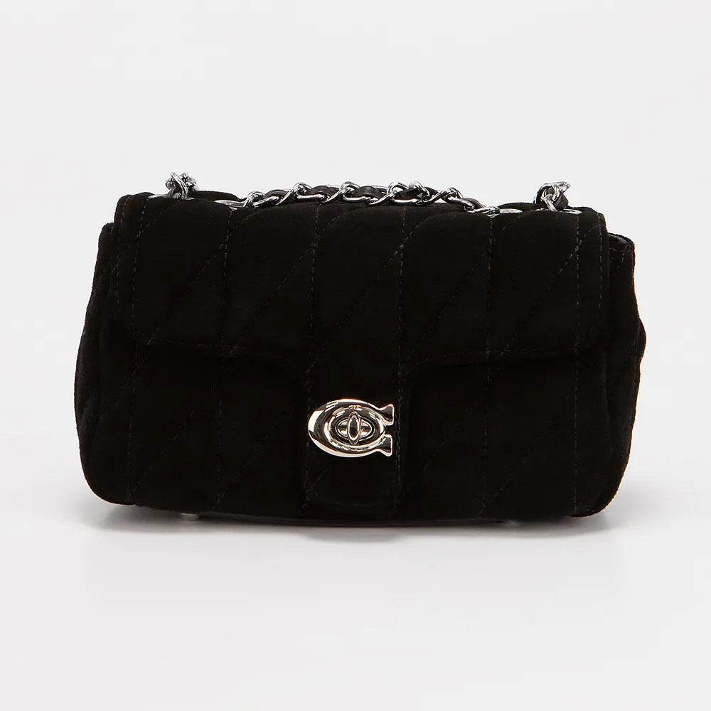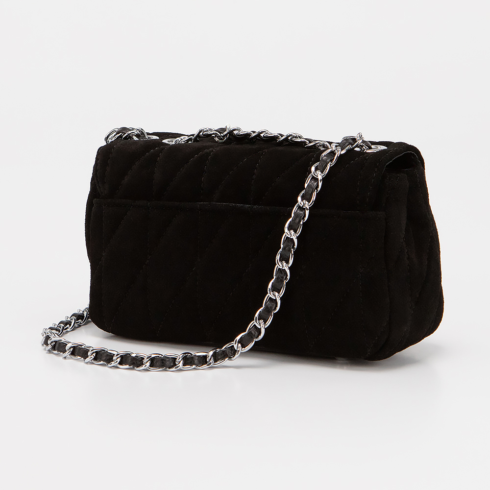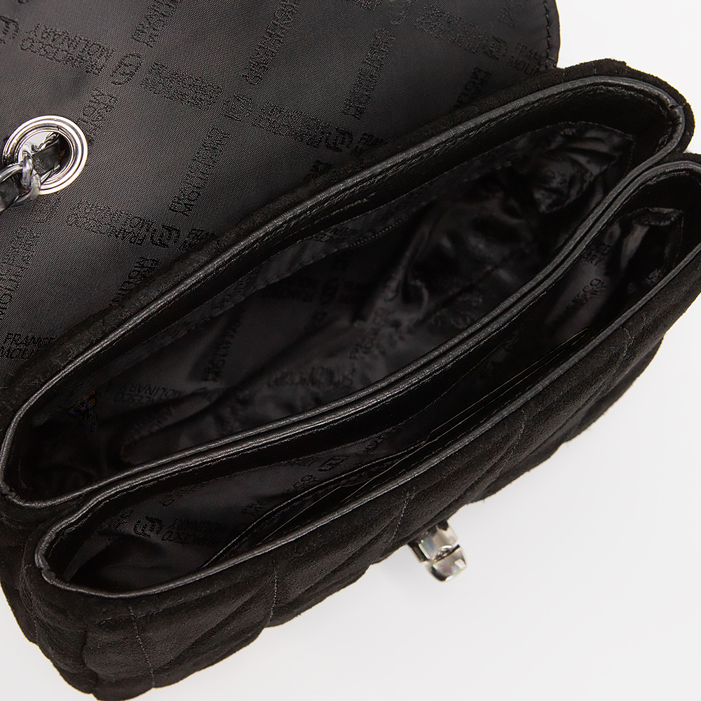 Сумка от торговой марки Francesco Molinary выполнена из натуральной замши черного цвета. Модель с ремнем-цепочкой. Декорирована стежкой. Клапан на поворотном замке закывает два отделения. Внутри: текстильная подкладка, карман на молнии, накладной карман.