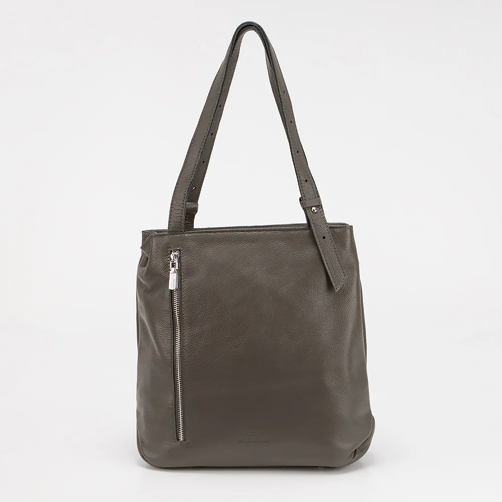 Сумка от торговой марки Poshete из натуральной кожи серого цвета. Модель с двумя длинными регулируемыми ручками. Отделение на молнии. Внутри текстильная подкладка, карман и средник на молнии, накладной карман. На лицевой и задней стороне карман на молнии.