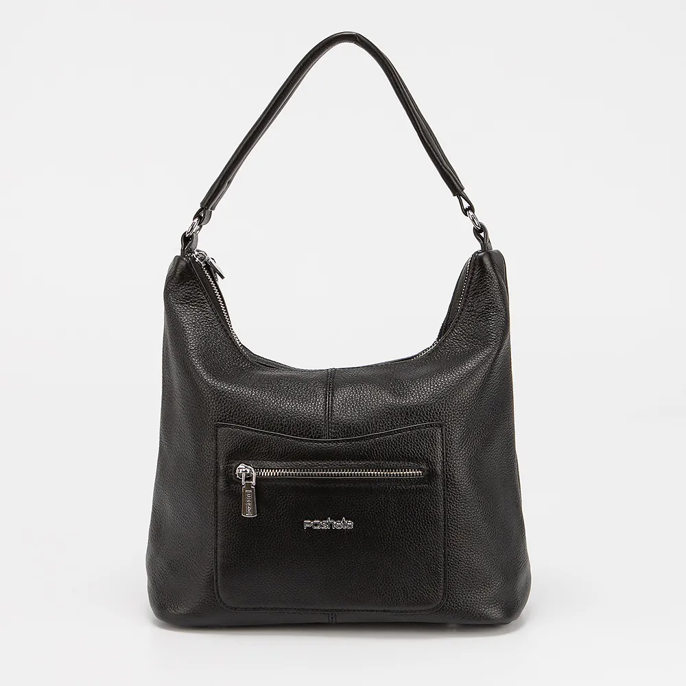 Сумка от торговой марки Poshete из натуральной кожи черного цвета. Модель с удлиненной ручкой. Два отделения на молнии. Внутри текстильная подкладка, карман на молнии, накладной карман. На лицевой и задней стороне карман на молнии.