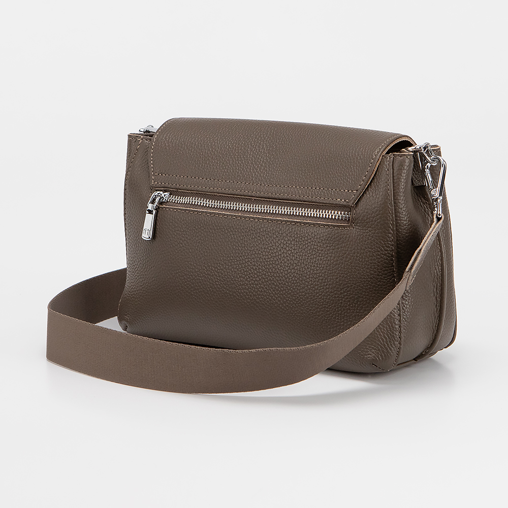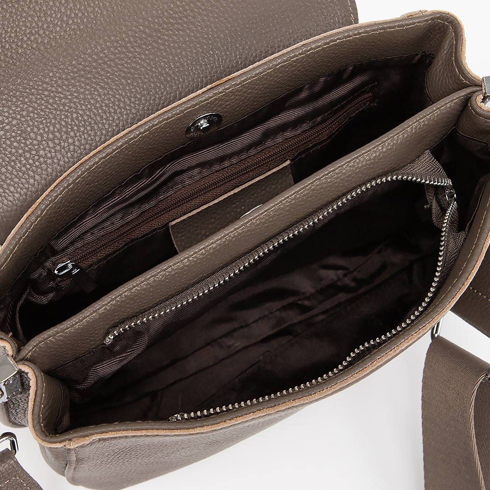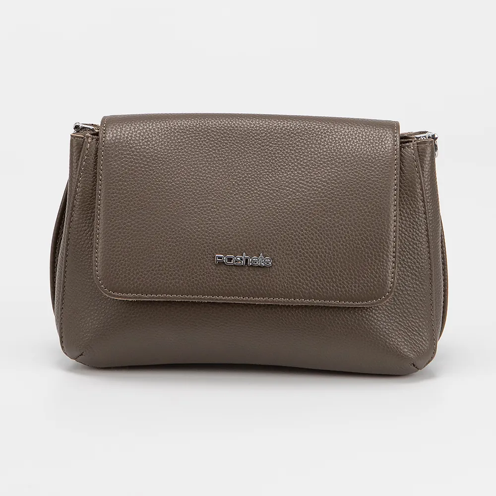 Сумка от торговой марки Poshete из натуральной кожи кофейного цвета. Модель с длинным регулируемым плечевым ремнем из текстильного материала. Клапан закрывает два отделения: одно - на молнии, другое - на магнитной кнопке. Внутри: фирменная подкладка, карман на молнии, накладной карман. На задней стороне - карман на молнии.