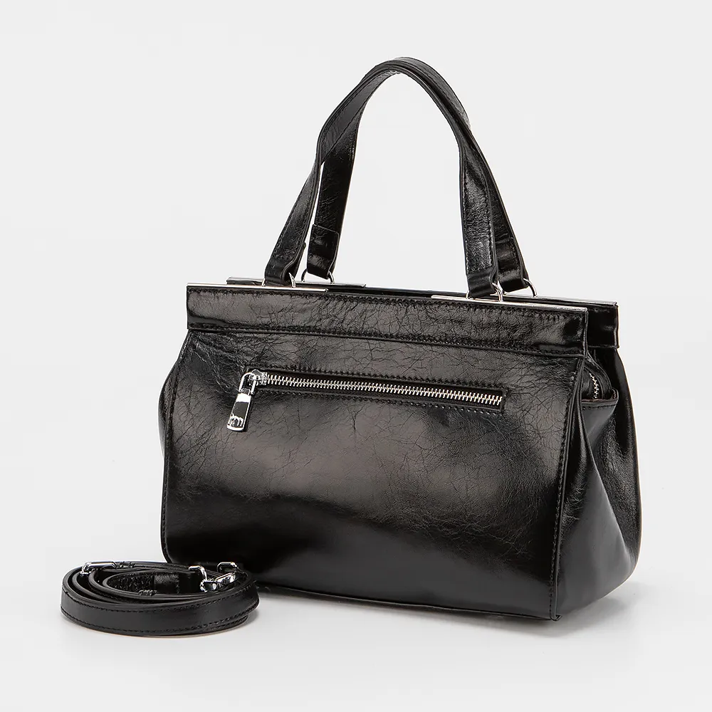 Сумка от торговой марки Poshete из натуральной кожи черного цвета. Модель с двумя ручками и съемным регулируемым плечевым ремнем. Отделение на молнии. Внутри: фирменная подкладка, карман на молнии, накладной карман. На задней стороне - карман на молнии.