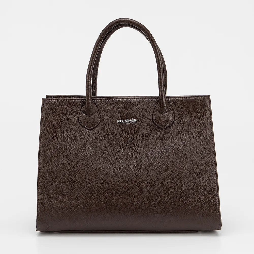Сумка от торговой марки Poshete из натуральной кожи коричневого цвета. Модель с двумя ручками и съемным регулируемым плечевым ремнем. Отделение на молнии. Внутри: фирменная подкладка, карман и средник на молнии, накладной карман. На задней стороне - карман на молнии.
