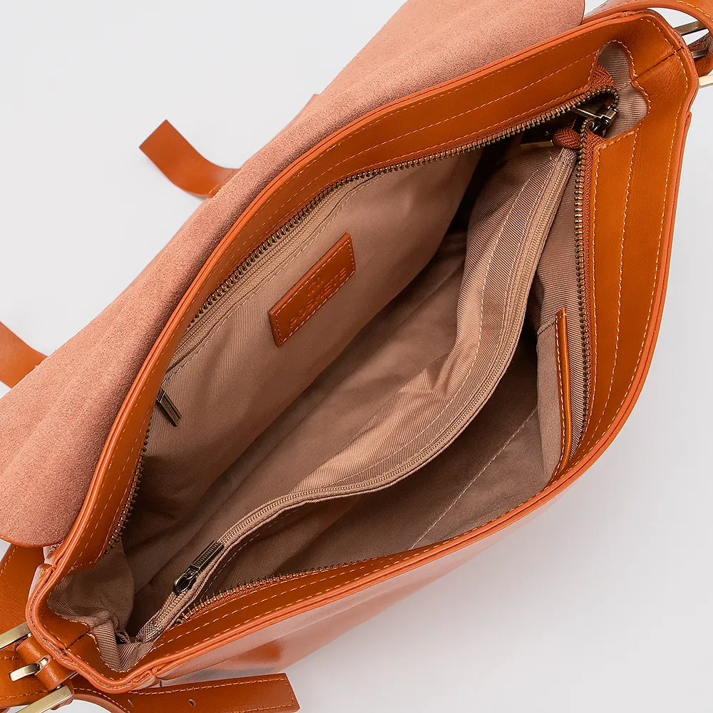 Сумка от торговой марки Poshete выполнена из натуральной кожи коричневого цвета. Модель с регулируемым плечевым ремнем. Клапан закрывает отделение на молнии. Внутри:текстильная подкладка, карман и средник на молнии, накладной карман. С задней стороны - карман на молнии.