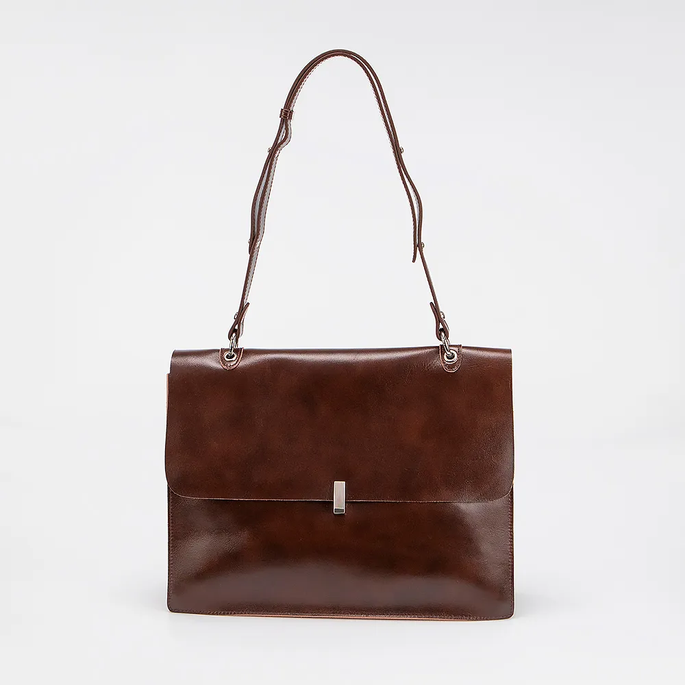 Сумка от торговой марки Poshete выполнена из натуральной кожи коричневого цвета. Модель с длинной регулируемой ручкой. Клапан закрывает отделение на молнии. Внутри: частичная текстильная подкладка, карман на молнии. На задней стороне - накладной карман.