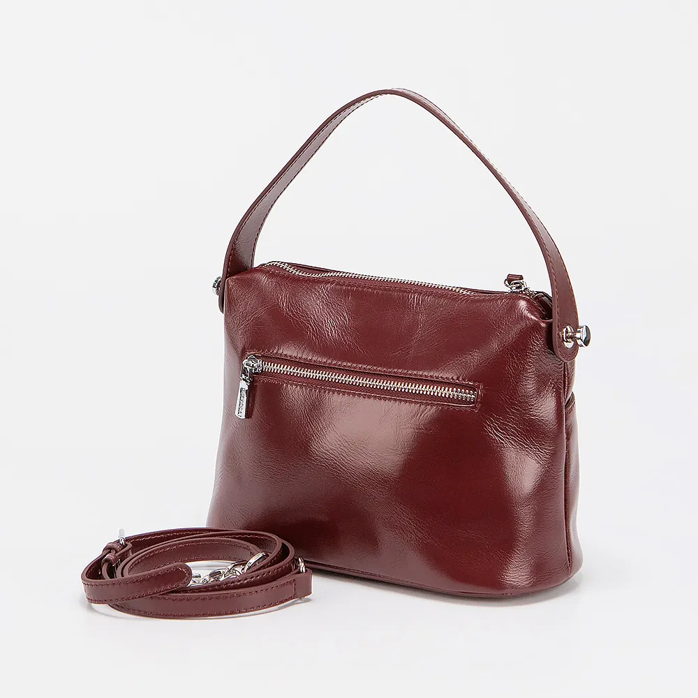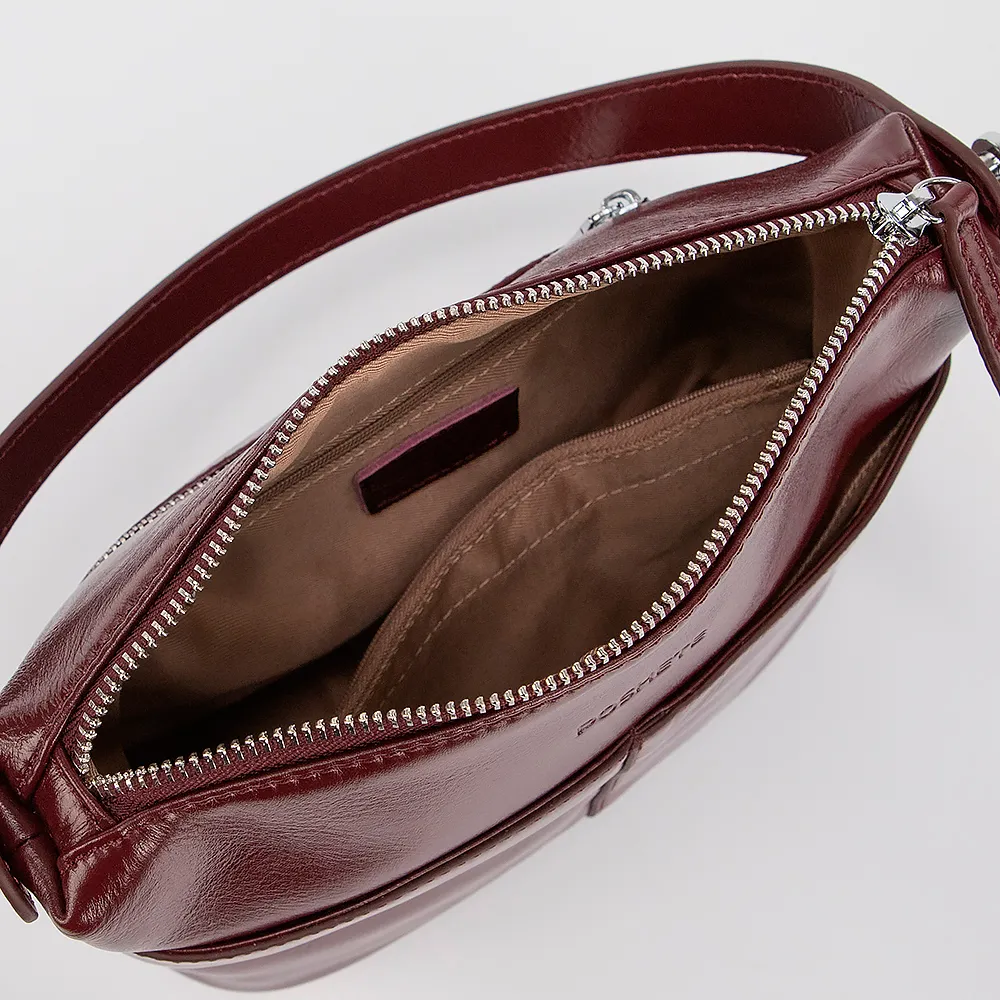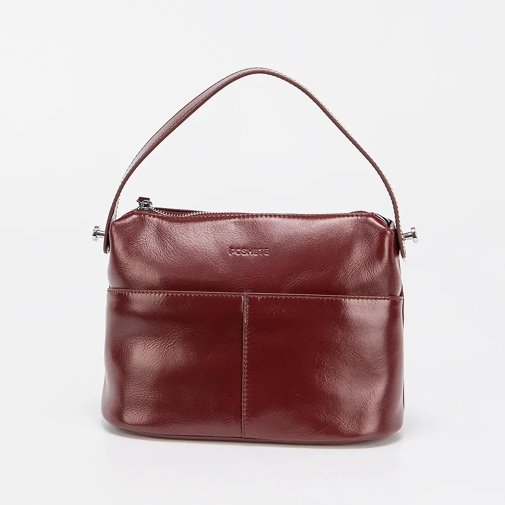 Сумка от торговой марки Poshete выполнена из натуральной кожи бордового цвета. Модель с длинной ручкой и съемным ремнем-цепочкой. Отделение на молнии. Внутри: текстильная подкладка, карман на молнии, накладной карман. На лицевой стороне - два накладных кармана. На задней стороне - карман на молнии.