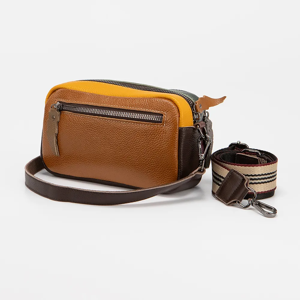 Сумка от торговой марки Poshete выполнена из натуральной кожи в сочетании нескольких цветов. Модель со съемным ремнем из натуральной кожи, в комплекте имеется широкий съемный текстильный ремень. Отделение на молнии. Внутри: текстильная подкладка, карман на молнии, накладной карман. С лицевой стороны два объемных кармана на молнии. На задней стороне - карман на молнии.