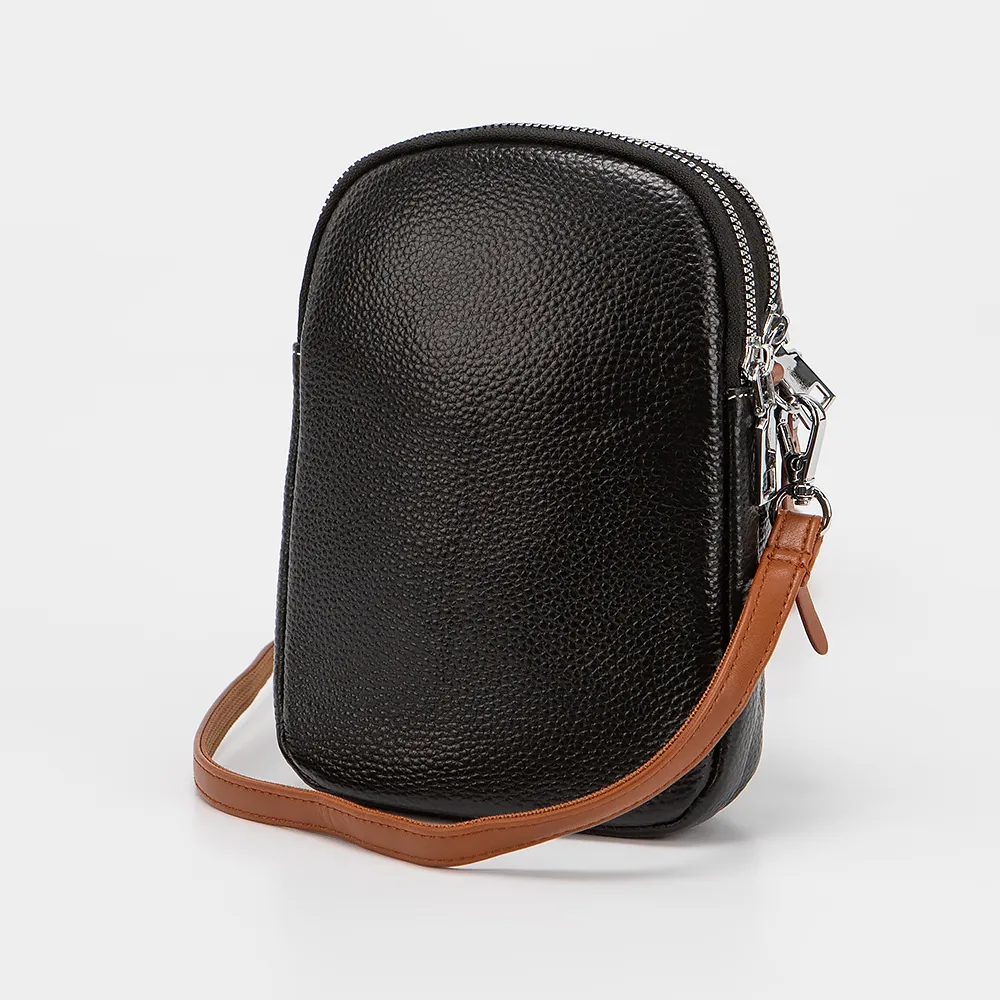 Сумка от торговой марки Poshete выполнена из натуральной кожи черного цвета. Компактная модель вертикальной ориентации со съемным тонким ремешком оранжевого цвета. Два отделения на молнии. С лицевой стороны карман на молнии.