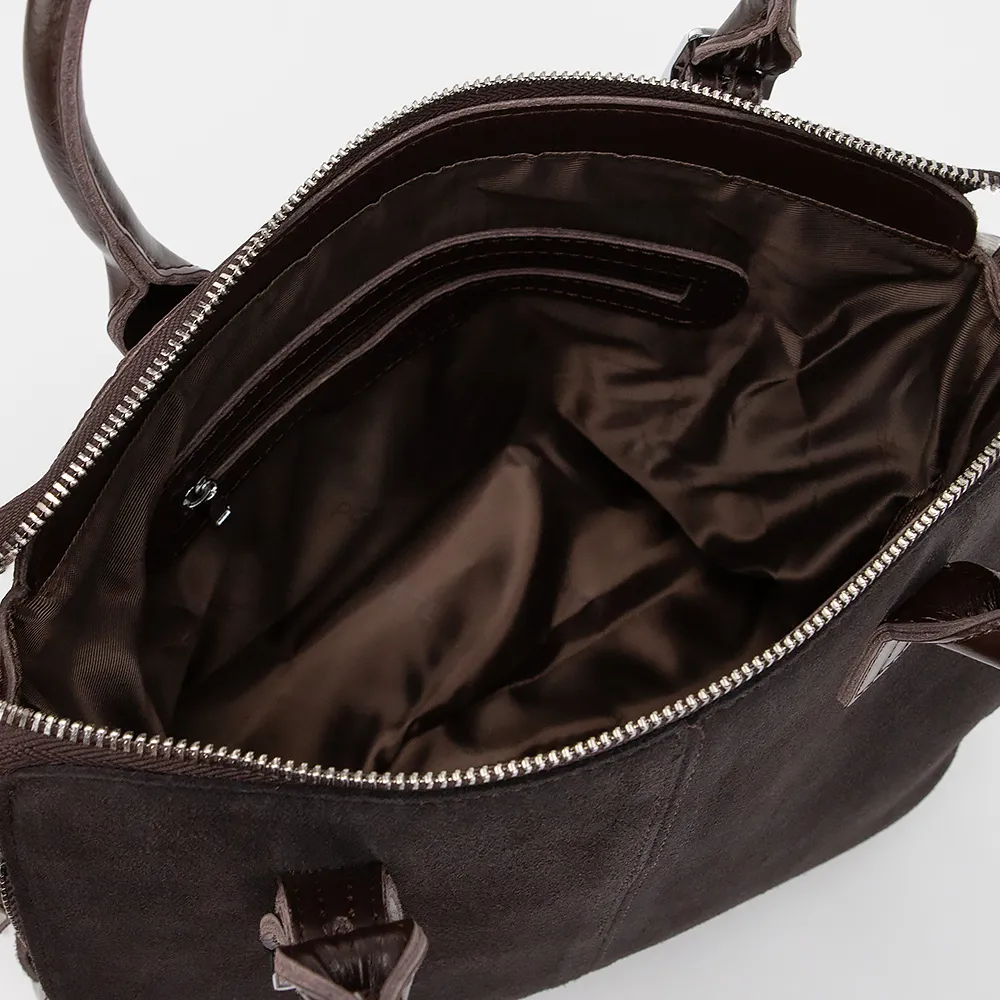 Сумка от торговой марки Poshete изготовлена из натуральной кожи и замши коричневого цвета. Модель с двумя плотными ручками и съемным регулируемым плечевым ремнем. Отделение на молнии. Внутри: фирменная подкладка, средник и карман на молнии, два накладных кармана. На задней стороне - карман на молнии. По бокам - вертикальный карман на молнии. Дно оснащено металлическими ножками для защиты от износа. Сумка подходит для документов формата А4.