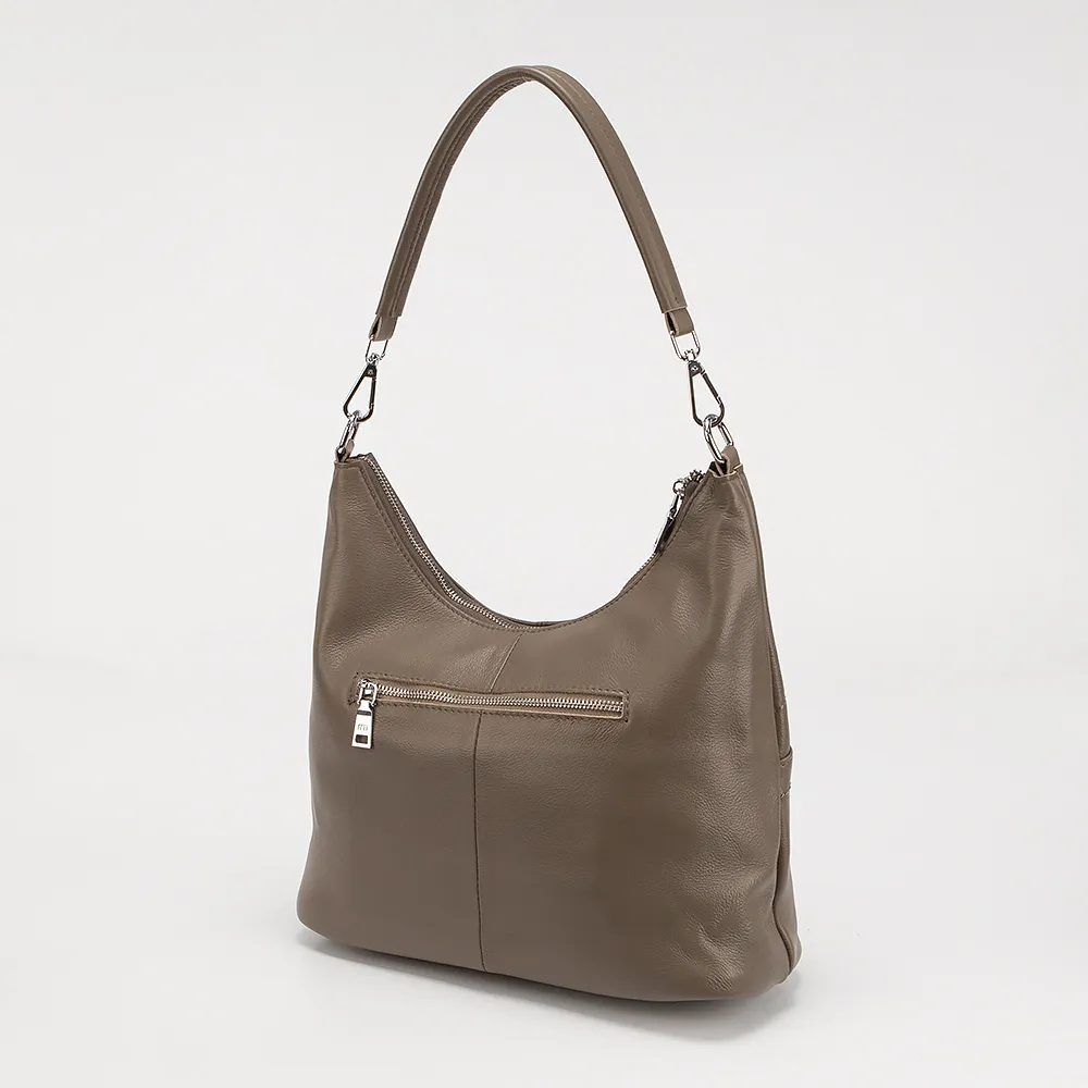 Сумка от торговой марки Poshete изготовлена из натуральной кожи серого цвета. Модель с удлиненной съемной ручкой. Отделение на молнии. Внутри: фирменная подкладка, средник и карман на молнии, накладной карман. На лицевой и задней стороне - карман на молнии.