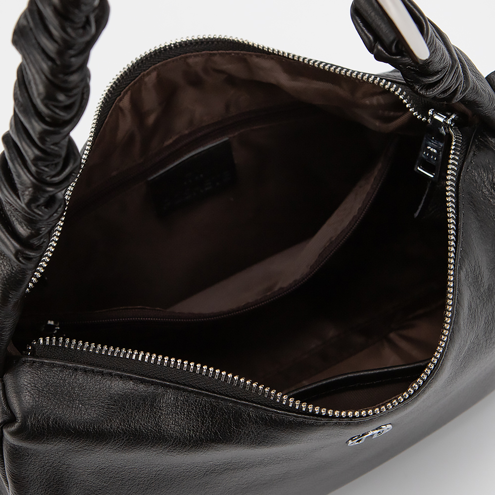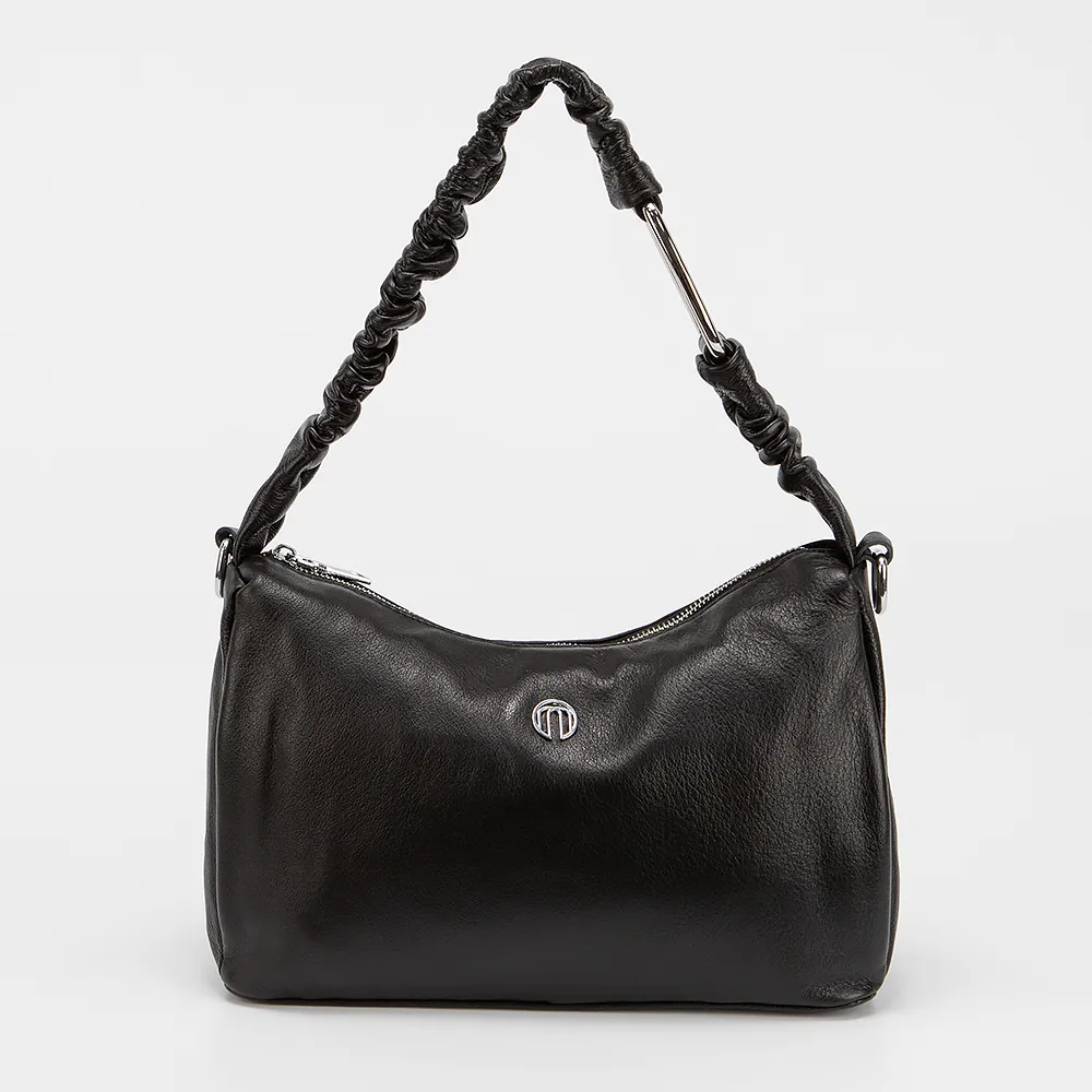Сумка от торговой марки Poshete изготовлена из натуральной кожи черного цвета. Модель с удлиненной ручкой и съемным регулируемым плечевым ремнем. Отделение на молнии. Внутри: текстильная подкладка, карман и средник на молнии, накладной карман. На задней стороне - карман на молнии.