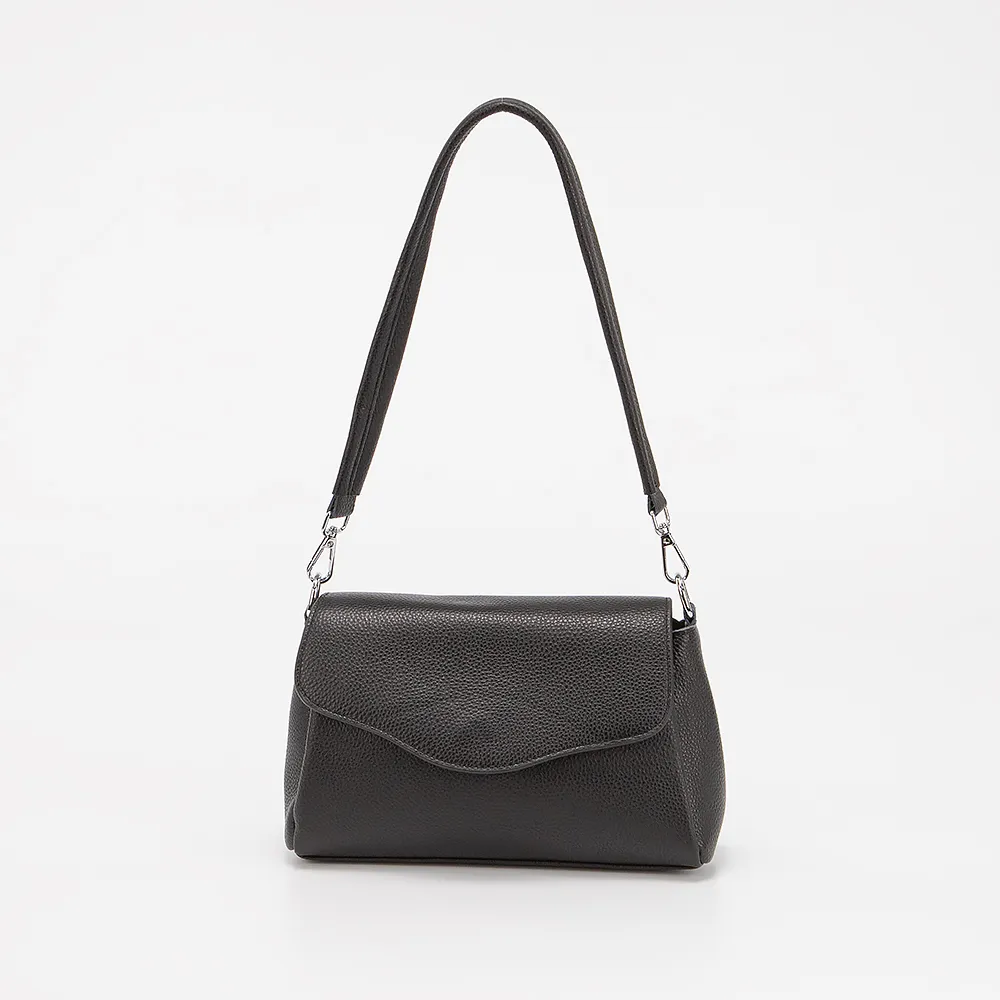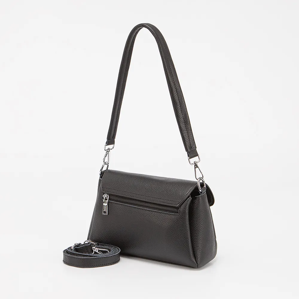 Сумка от торговой марки Poshete выполнена из натуральной кожи черного цвета. Модель с удлиненной ручкой и съемным регулируемым плечевым ремнем. Клапан закрывает отделение на молнии. Внутри: три отсека, текстильная подкладка. На задней стороне - карман на молнии.