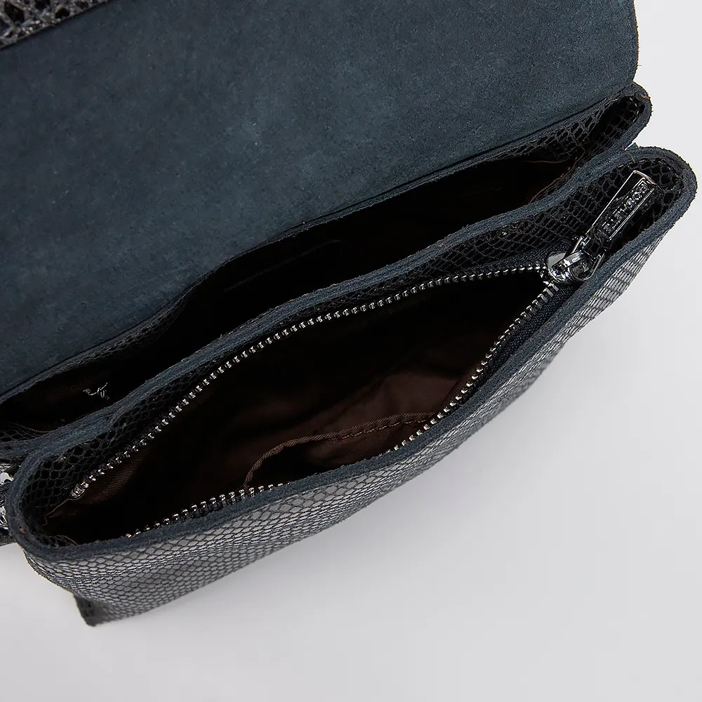 Сумка от торговой марки Poshete выполнена из натуральной кожи серого цвета с лазерной обработкой и тиснением под рептилию. Модель с длинным регулируемым плечевым ремнем. Клапан закрывает два отделения на молнии. Внутри: текстильная подкладка, карман на молнии, накладной карман.