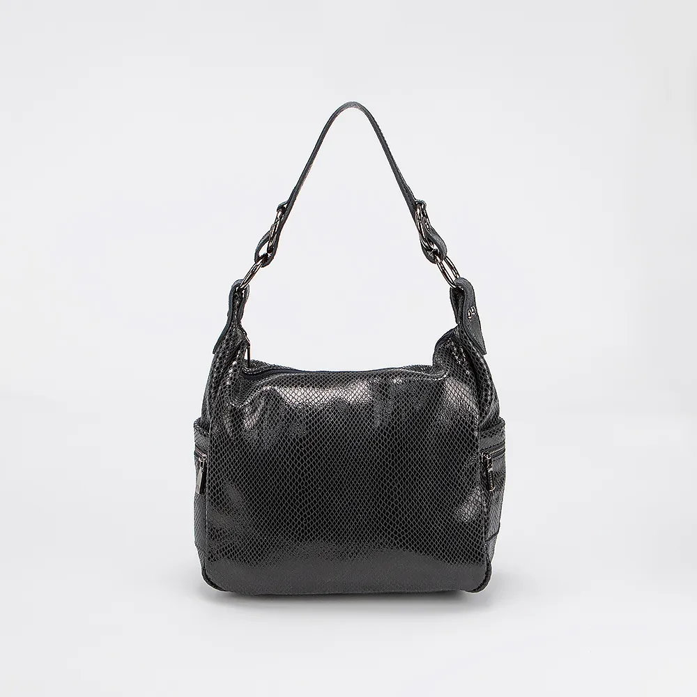 Сумка от торговой марки Poshete выполнена из натуральной кожи серого цвета с лазерной обработкой и тиснением под рептилию. Модель с удлиненной ручкой и съемным регулируемым плечевыми ремнем. Отделение на молнии. Внутри: текстильная подкладка, карман и средник на молнии, накладной карман. По бокам - накладной карман без застежки, декорирован молнией. На задней стороне - карман на молнии.
