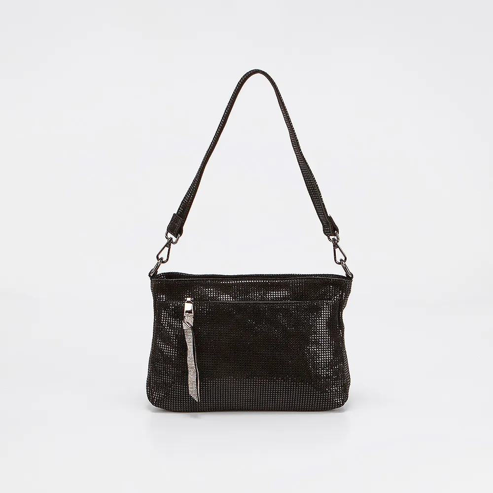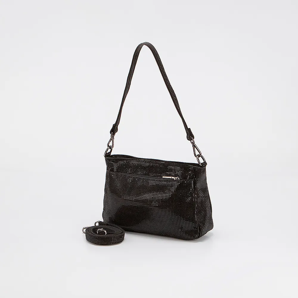 Сумка от торговой марки Poshete выполнена из натуральной кожи черного цвета. Модель с удлиненной ручкой и длинным регулируемым плечевым ремнем. Отделение на молнии. Внутри: текстильная подкладка, карман и средник на молнии, накладной карман. На лицевой и задней стороне - карман на молнии.